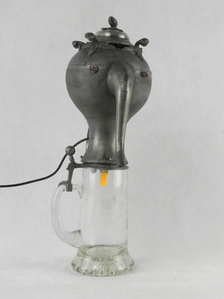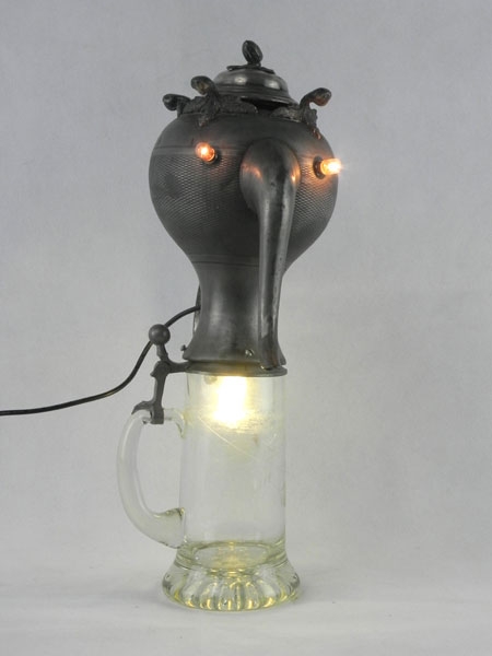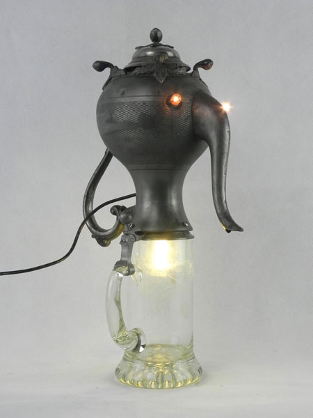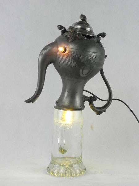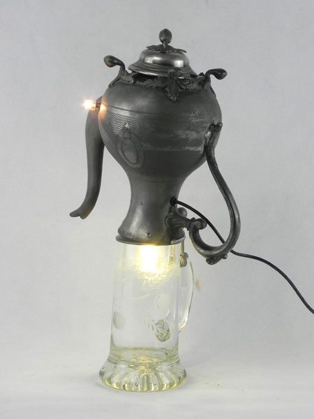 Sculpture lumineuse théière anglaise et chope à bière. détournement d’objets finement travaillés, gravée. Etain et verre,