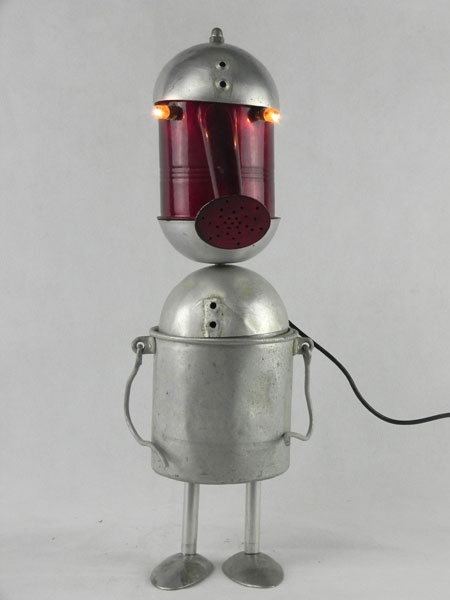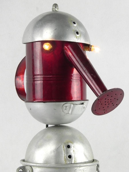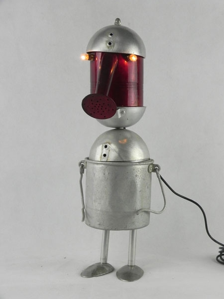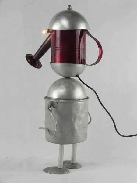 Association lumineuse d’un arrosoir, un seau, trois louches et 2 cuillères, Détournement d’objets en aluminium.
