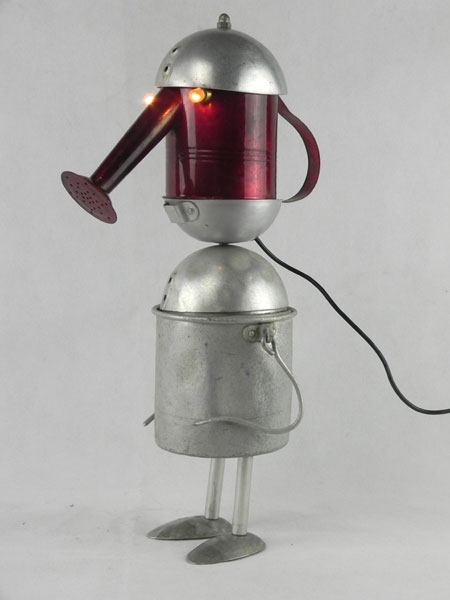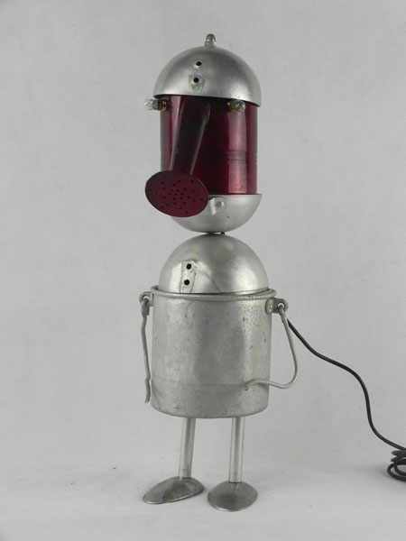 Association lumineuse d’un arrosoir, un seau, trois louches et 2 cuillères au pieds, Détournement d’objets en aluminium.