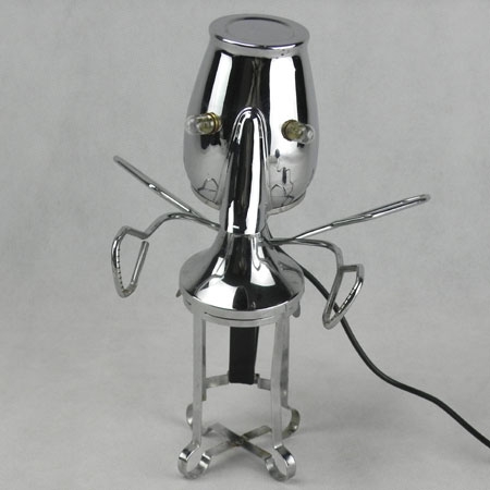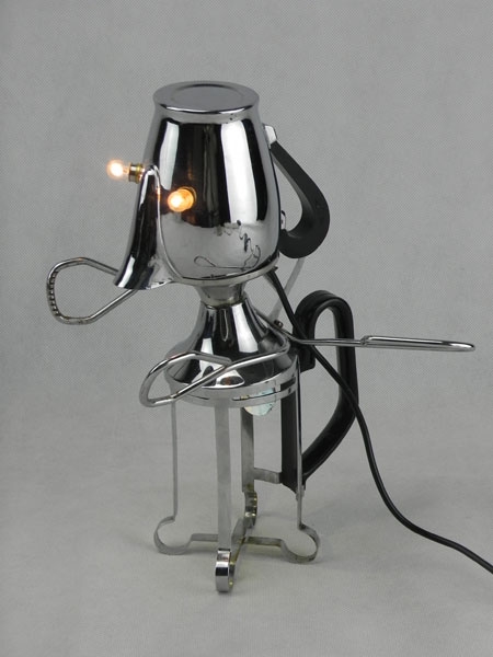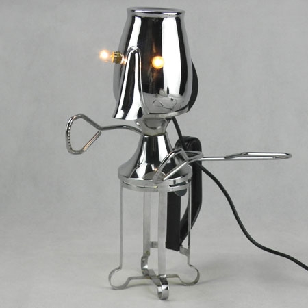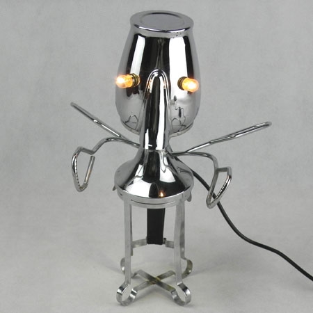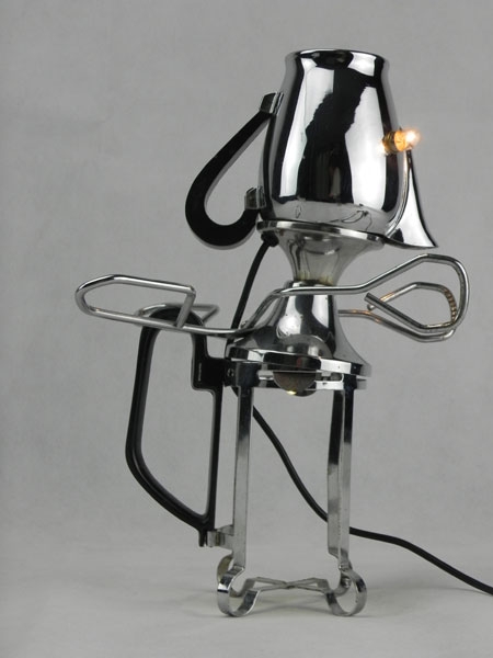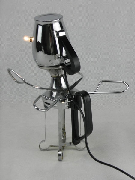 Objet lumineux par assemblage métal chromé. Détournement d’un pot à lait, une longue pince et un porte-verre,