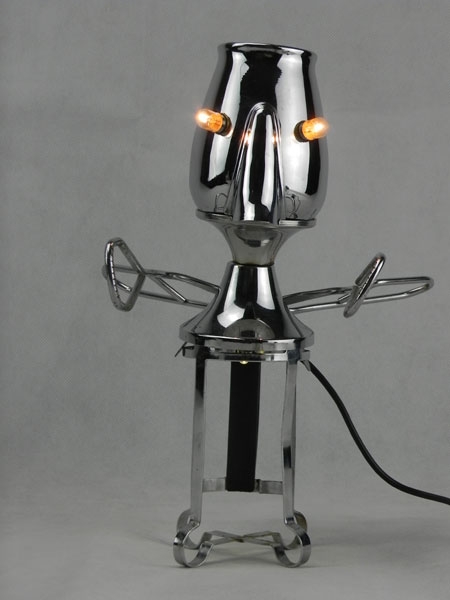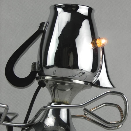 Luminous object by chromed metal assembly. Diversion of a milk pot, a long clamp and a glass holder,