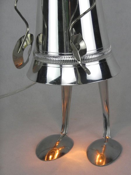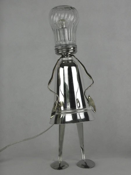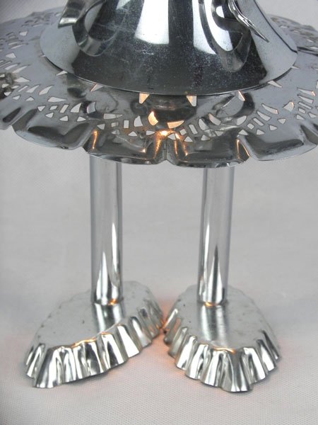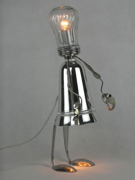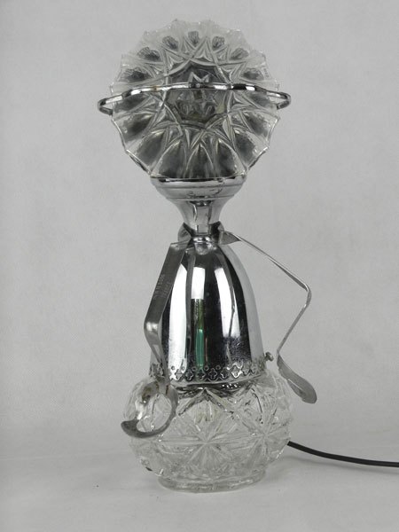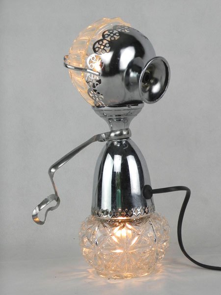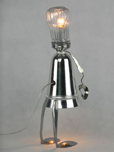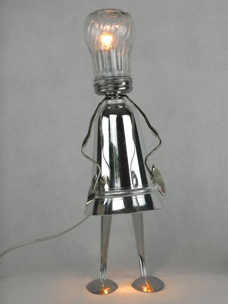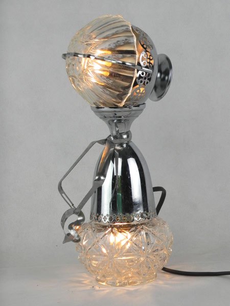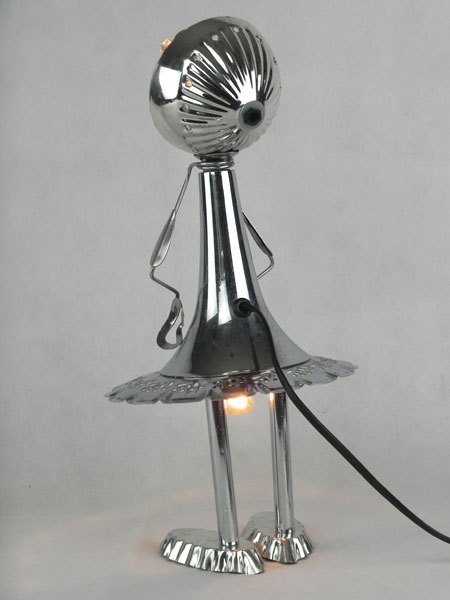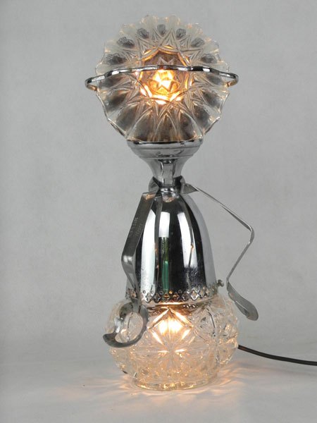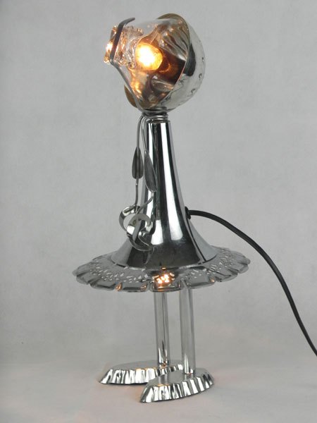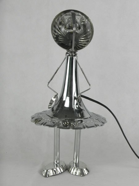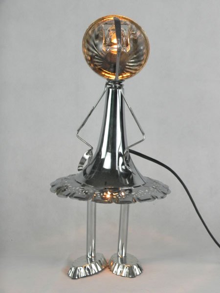 Female sculpture in diverted objects, lamp. Assembly: sports cup, glass cup, 2 tart moulds, snail claw. Patinated metal.