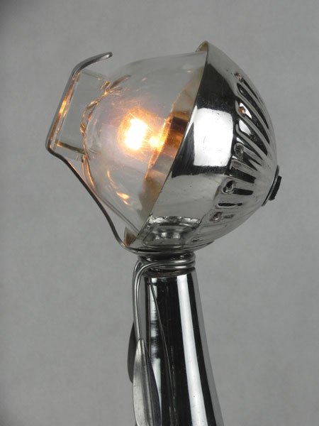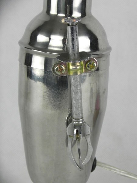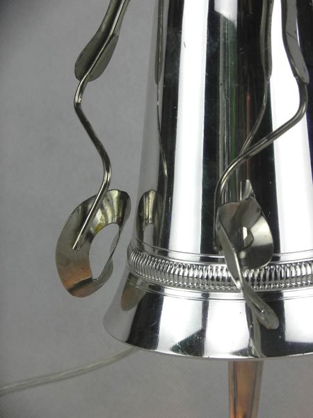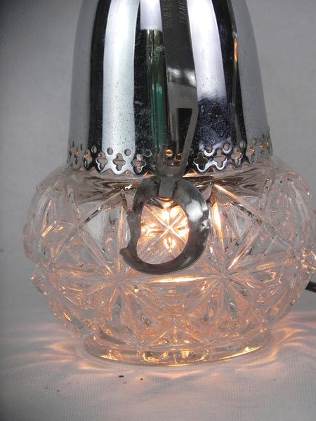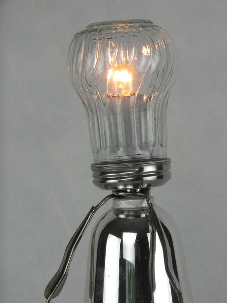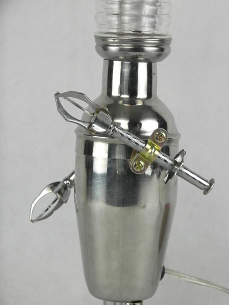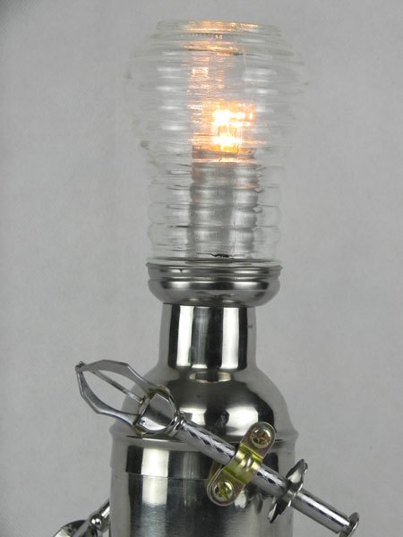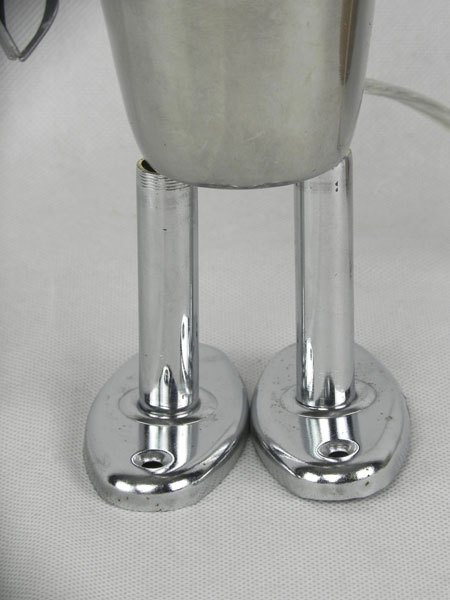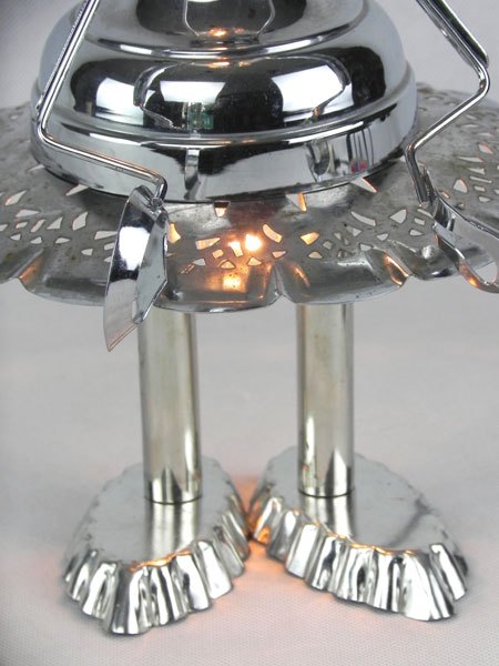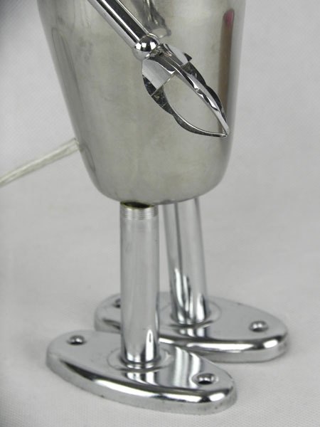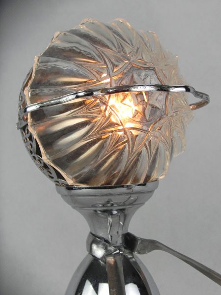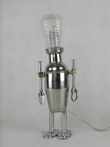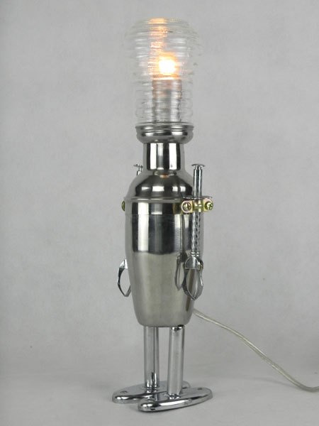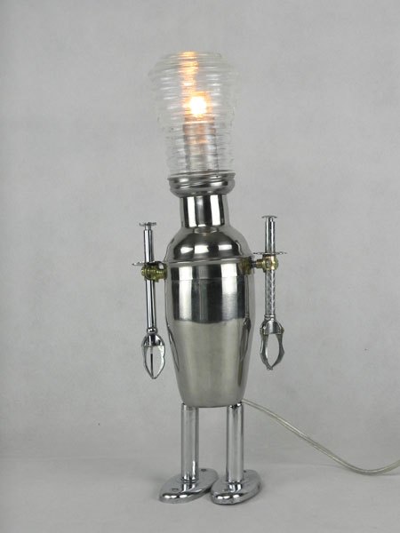 Female sculpture in diverted objects, lamp. Assembly: sports cup, glass cup, 2 tart moulds, snail claw. Patinated metal.