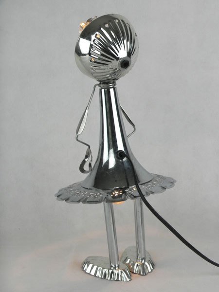Sculpture féminine en objets détournés, lampe. Assemblage: coupe de sport, coupe en verre, 2 moules à tartelette, pince à escargot. Métal patiné.
