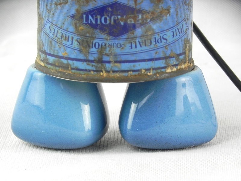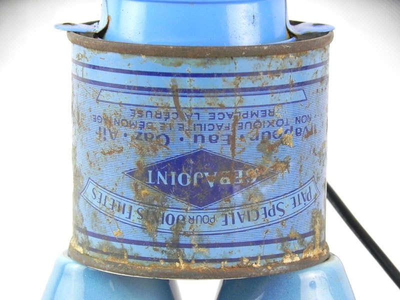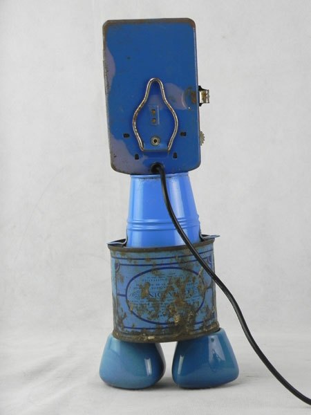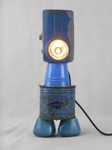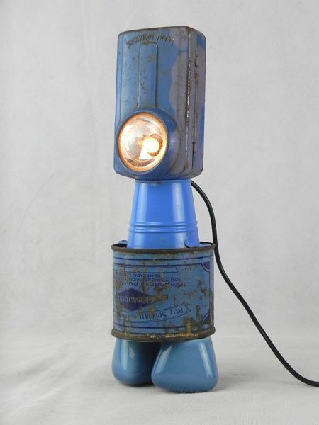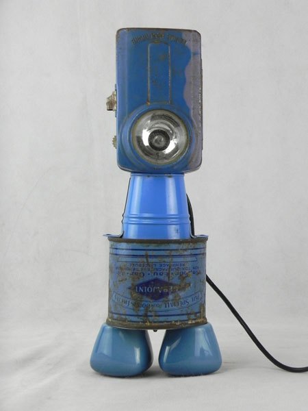 Détournement d’une lampe de poche bleue avec un mini seau, une boite de plomberie et 2 poignées de robinet.
