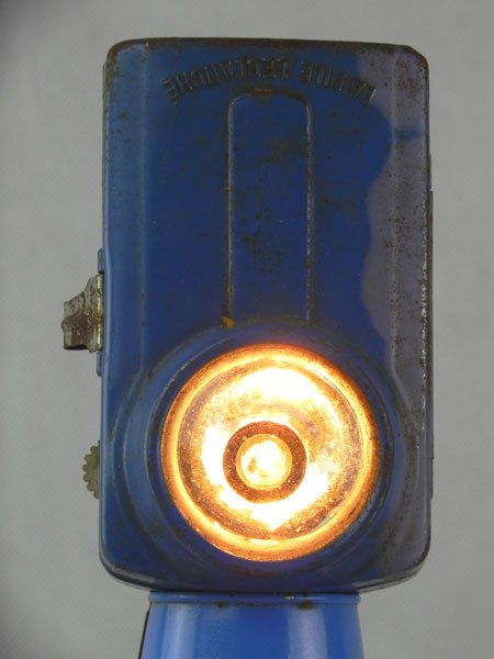 Assembly of a flashlight and a container of holy water « Souvenir de Lourdes » with a mechanical part. Recycling, light diversion.