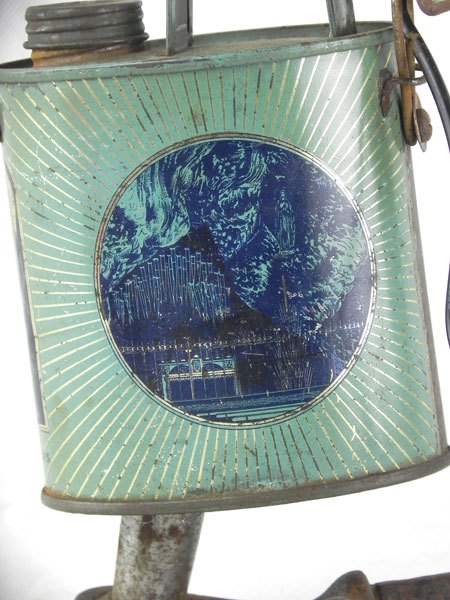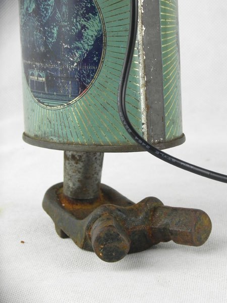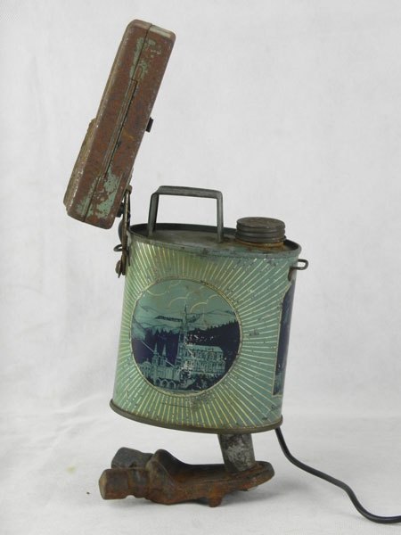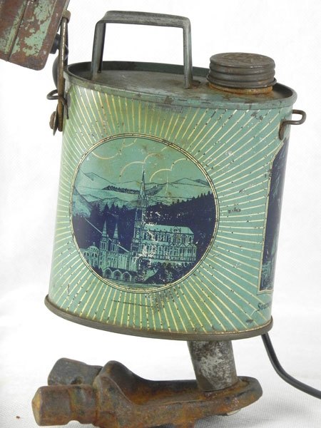 Assemblage d’une lampe de poche et d’un bidon d’eau bénite « Souvenir de Lourdes » avec une pièce mécanique.