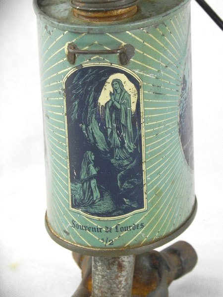 Composition: bidon d’eau bénite « Souvenir de Lourdes », lampe de poche, pièce mécanique .