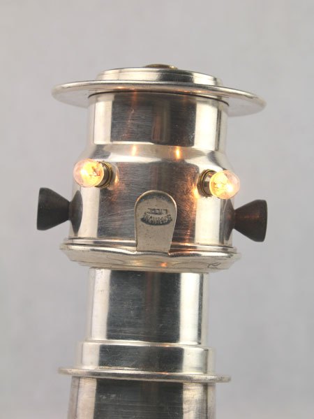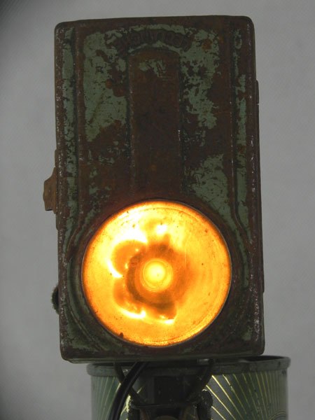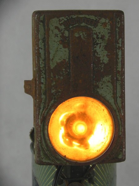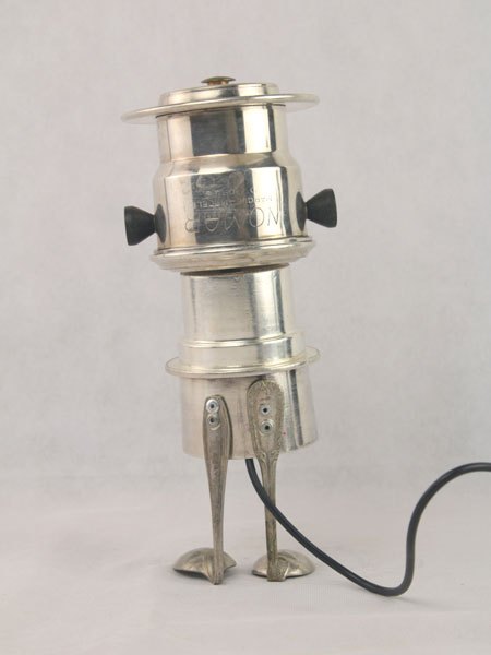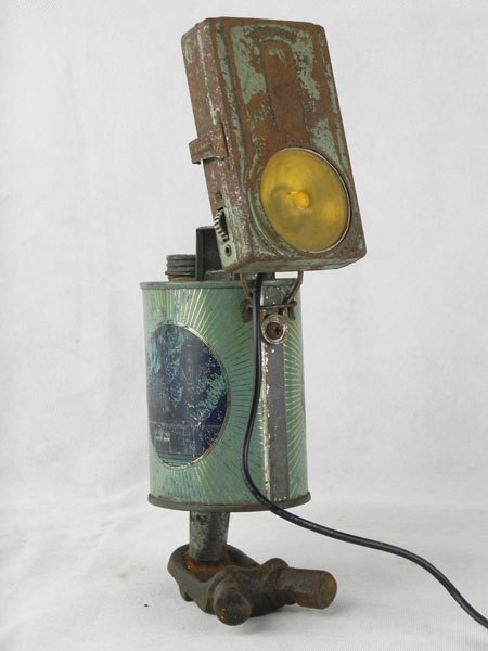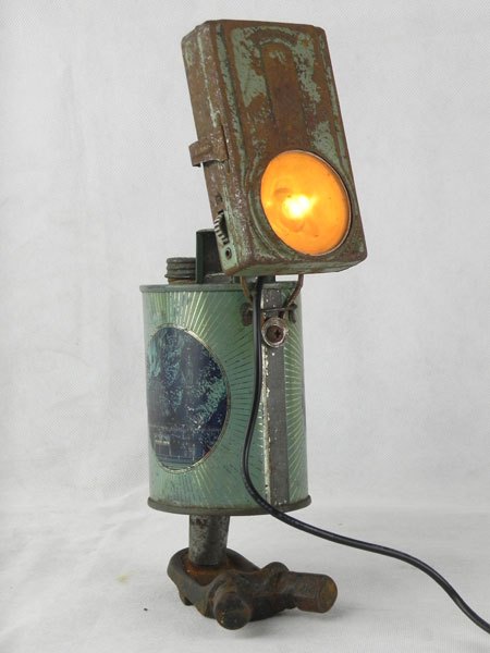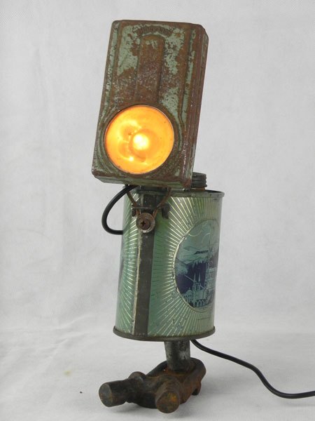 Assemblage d’une lampe de poche et d’un bidon d’eau bénite « Souvenir de Lourdes » avec une pièce mécanique. Recyclage, détournement lumineux.