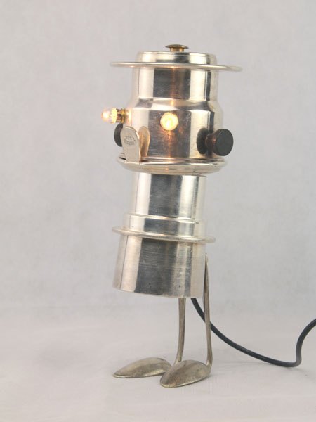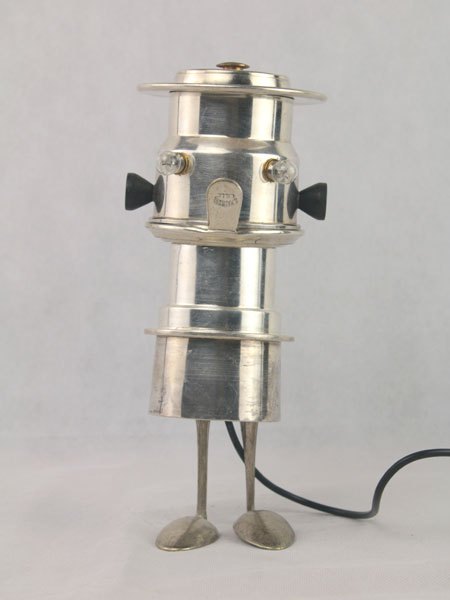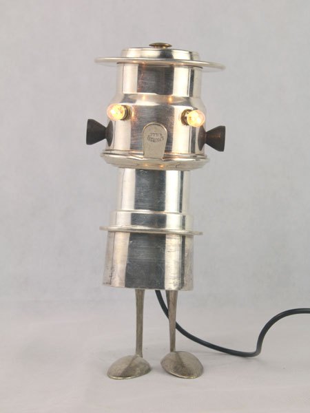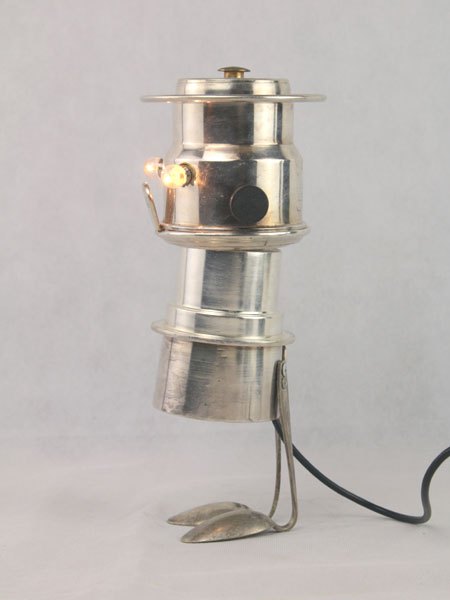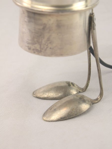 Sculpture light coffee silver. Coffee set with two spoons. Diversion of precious objects, assembly, lamp