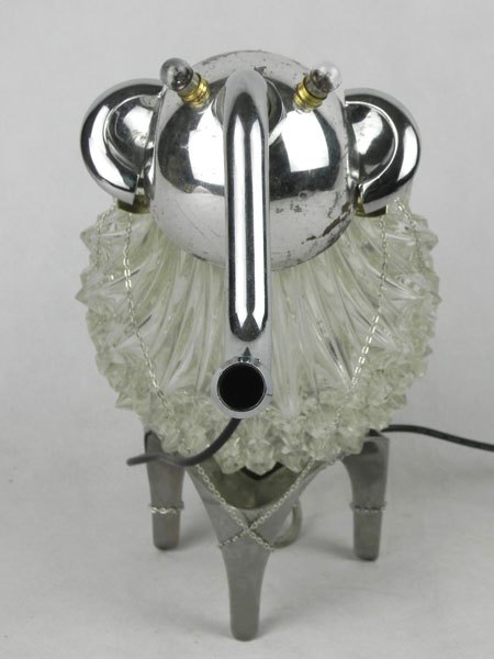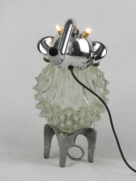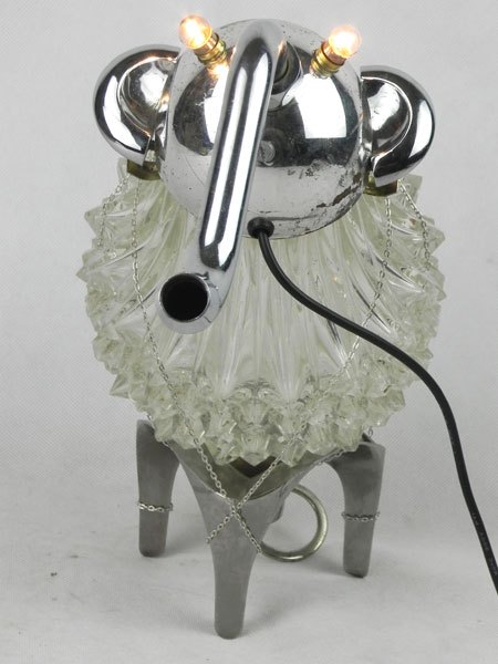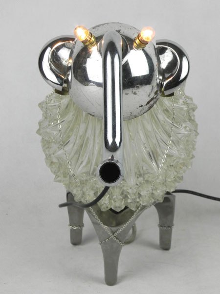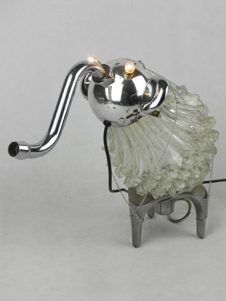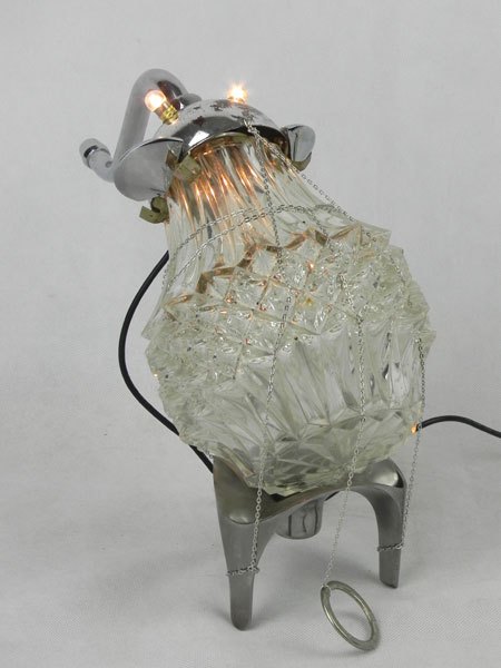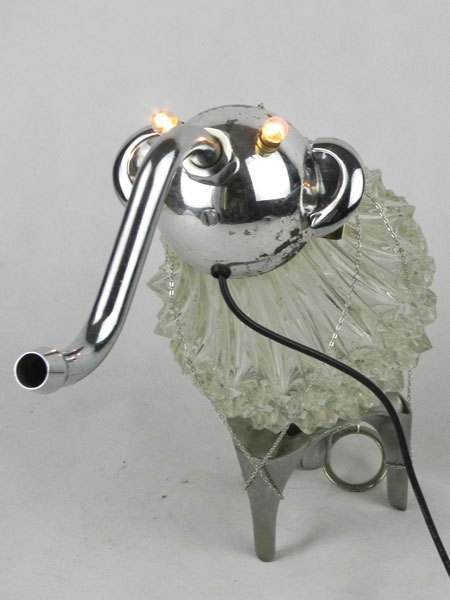 Drôle d’animal à trompe avec verrerie. Assemblage d’un verre de lustre, une coupe de sport, un robinet, deux poignées, un socle.
