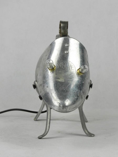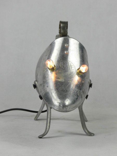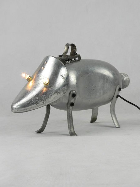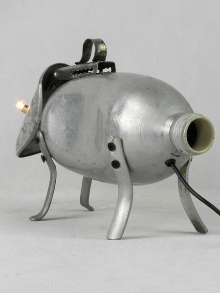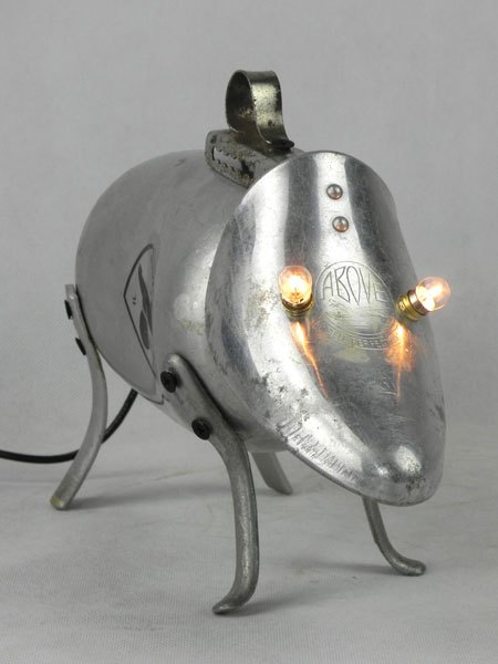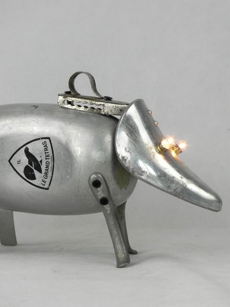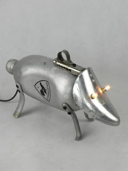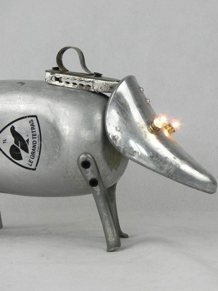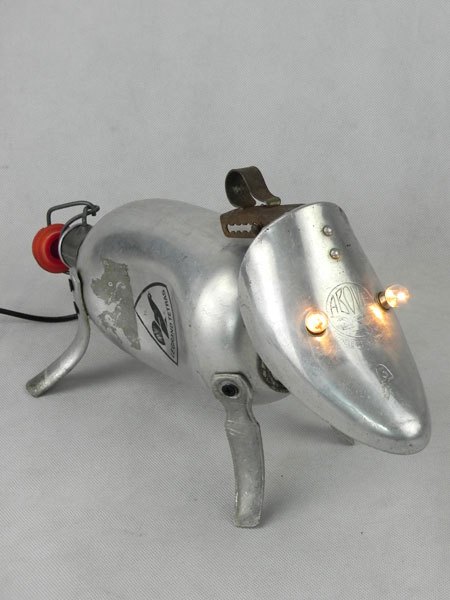 Sculpture chien lumineux en aluminium recyclé. Assemblage d’une gourde, un embauchoir « ABOVE » et quatre pieds de passoire.