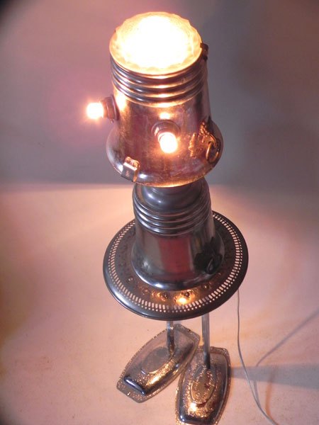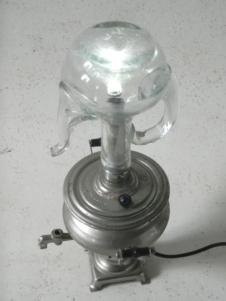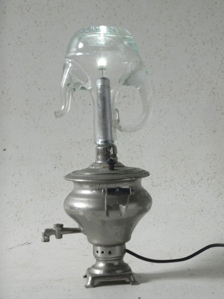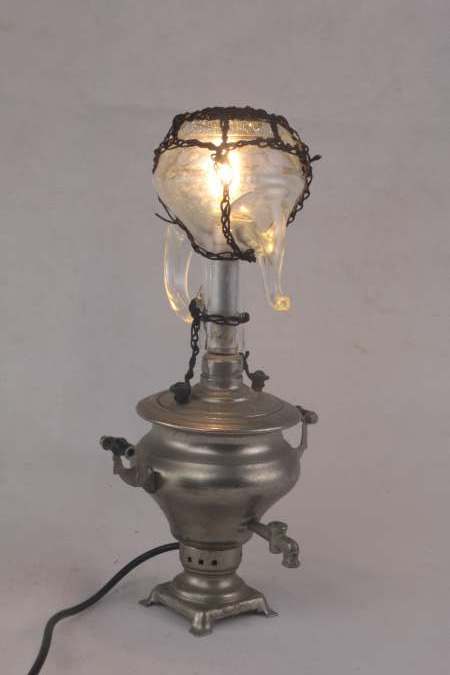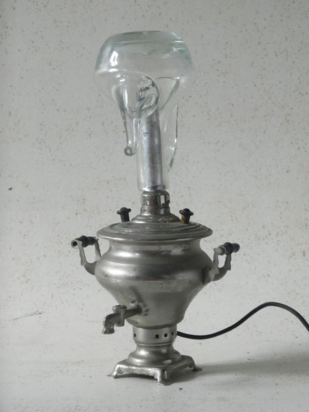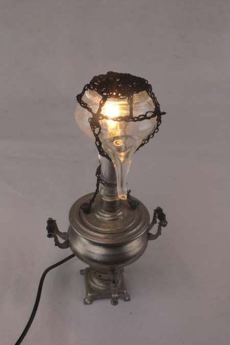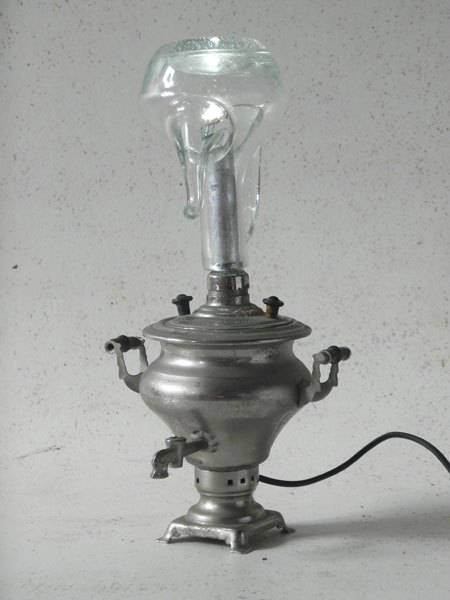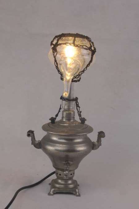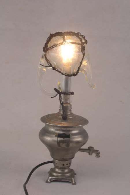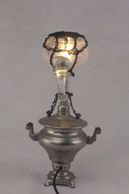 Miniature samovar light assembly and oil bottle.