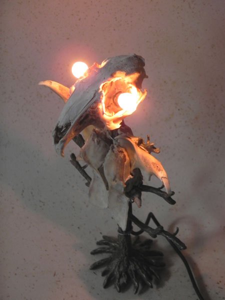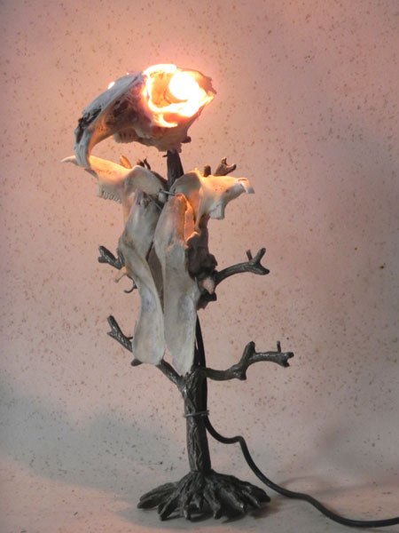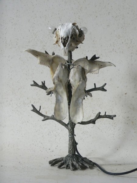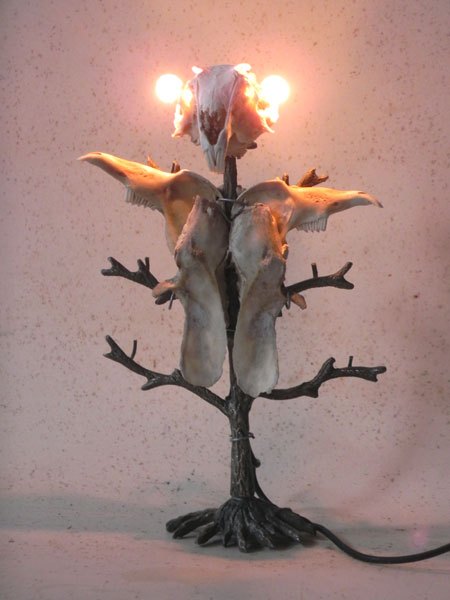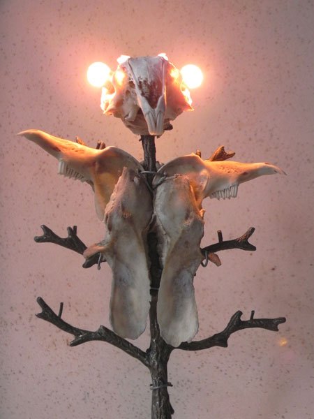 Lapin crucifié sur un porte photo en forme d’arbre. Sculpture lumineuse, assemblage d’os.