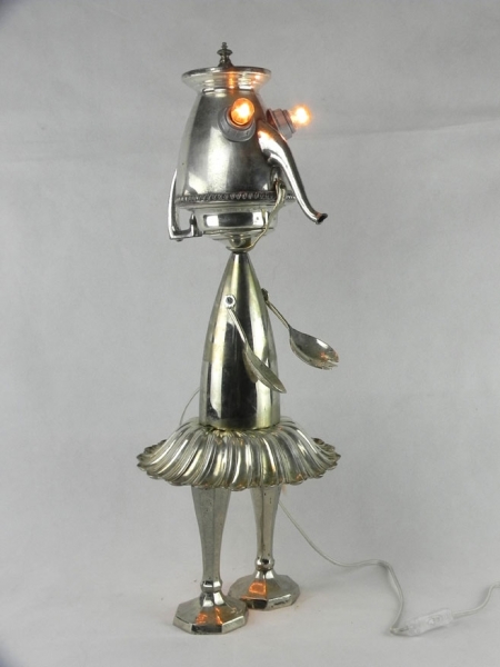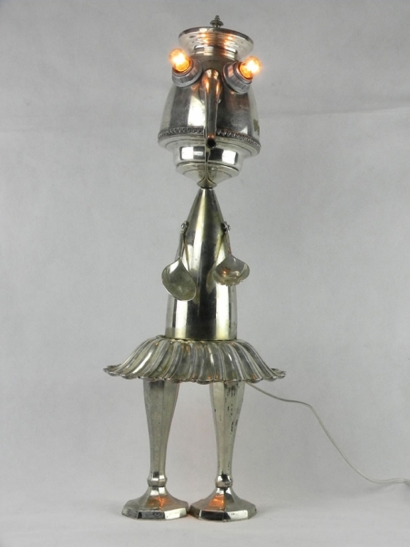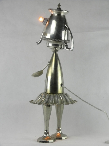 Personnage lumineux par assemblage d’objets chromés, inox. Avec une bouilloire, une poubelle, un sceau à glace, deux clenches et deux plaques de porte.