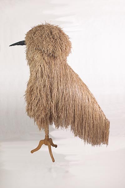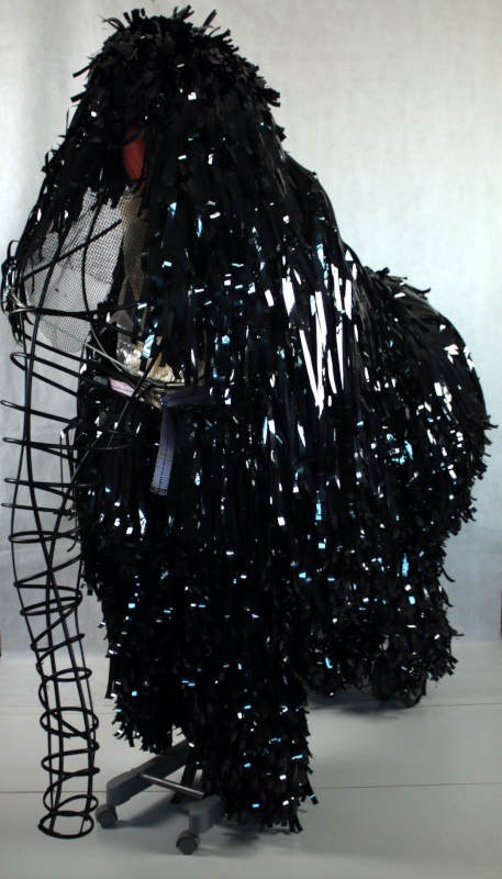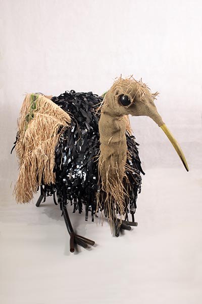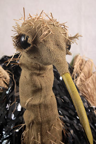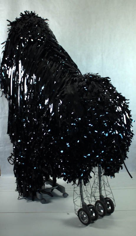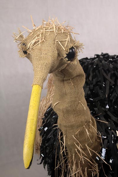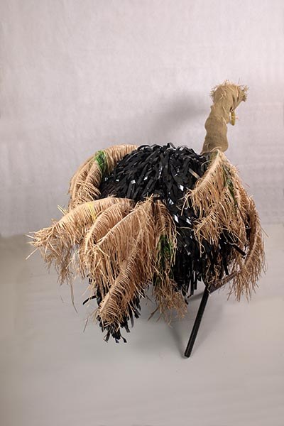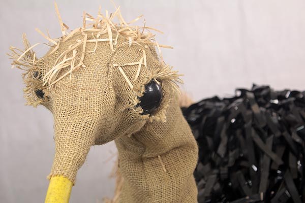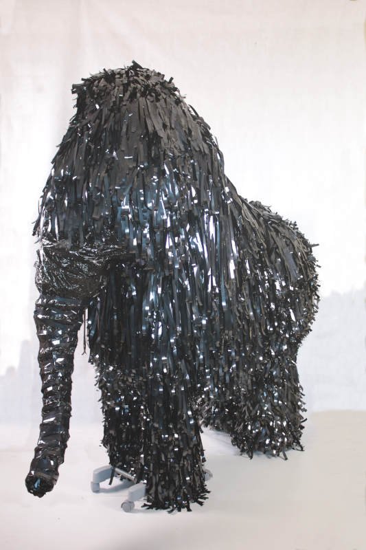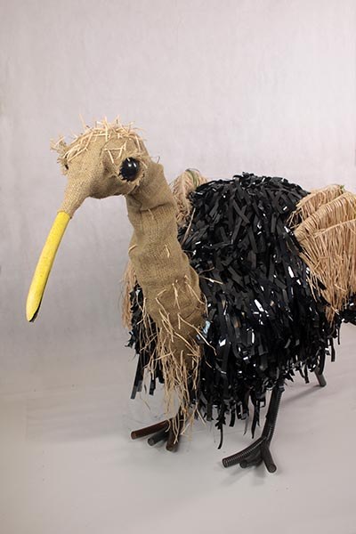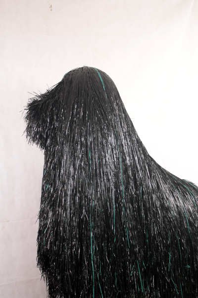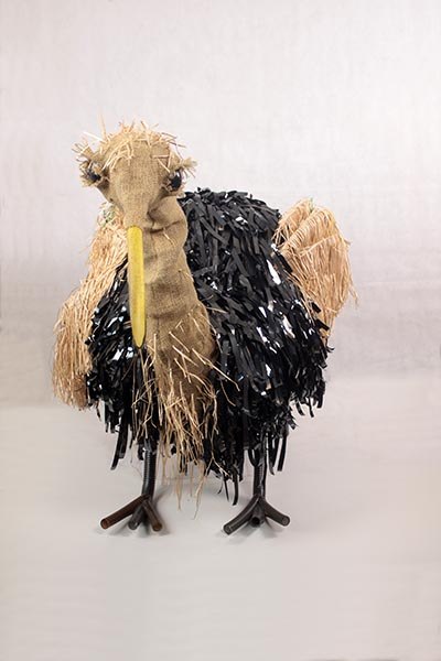 Année de création: 2023. Dimensions: 85 x 160 x 80 cm. Poids: 6 kg. Matières: plastiques, métal, toile de jute. Composition: bande magnétique de VHS, bâches de sac à usage unique, structure en fauteuil et tubes, bec en tuyau d’arrosage. Pièce unique. Animal en bâche détissée et bande magnétique.
