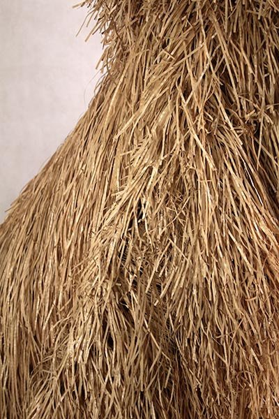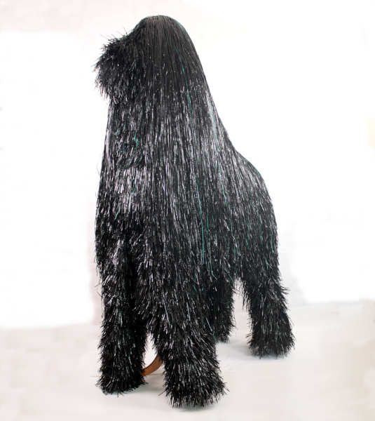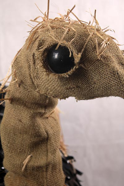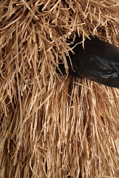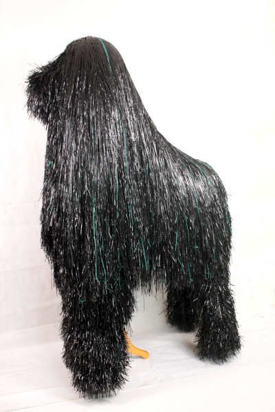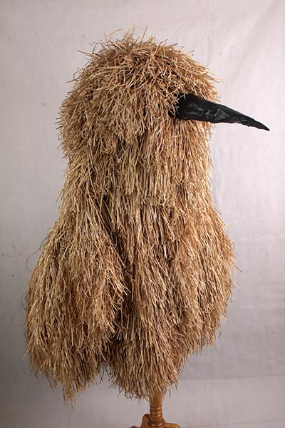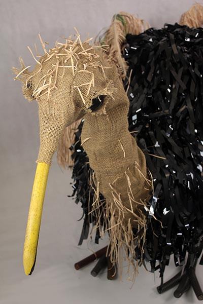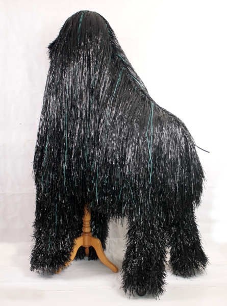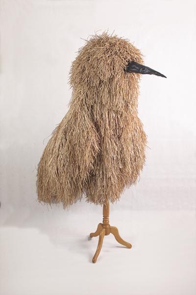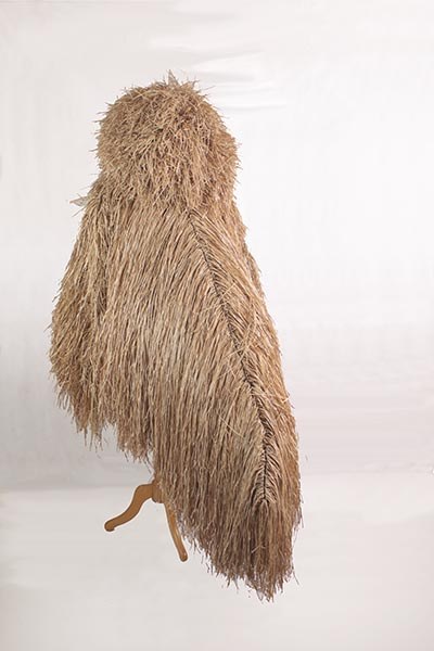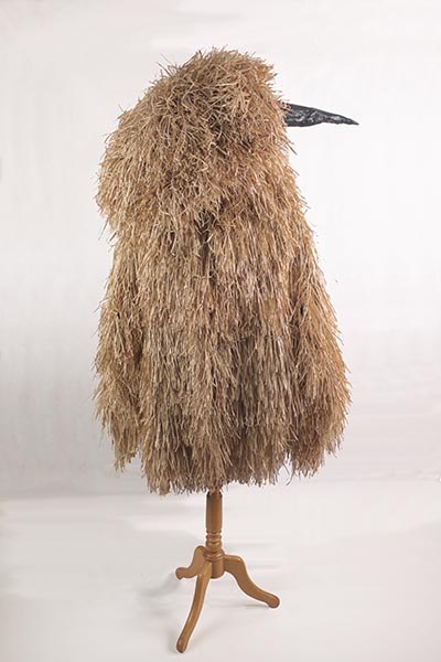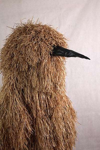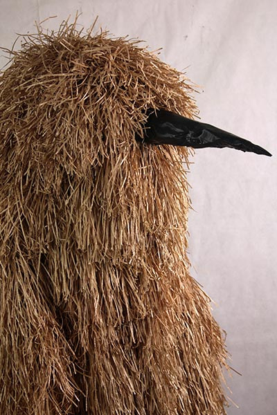 Année de création: 2023. Dimensions: 85 x 160 x 80 cm. Poids: 6 kg. Matières: plastiques, métal, toile de jute. Composition: bande magnétique de VHS, bâches de sac à usage unique, structure en fauteuil et tubes, bec en tuyau d’arrosage. Pièce unique. Animal en bâche détissée et bande magnétique.