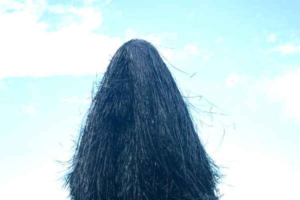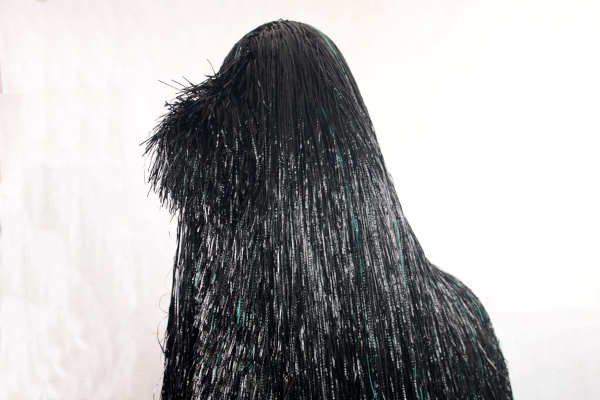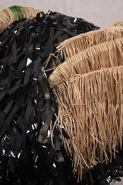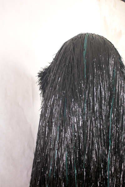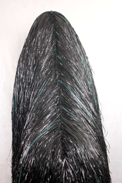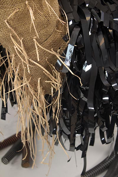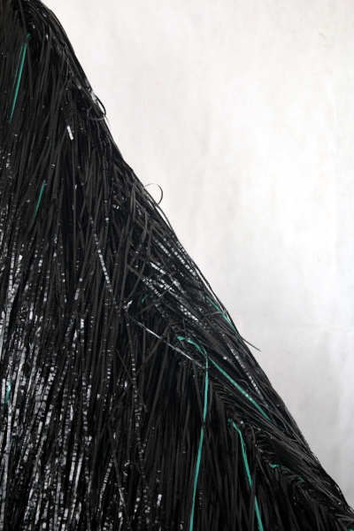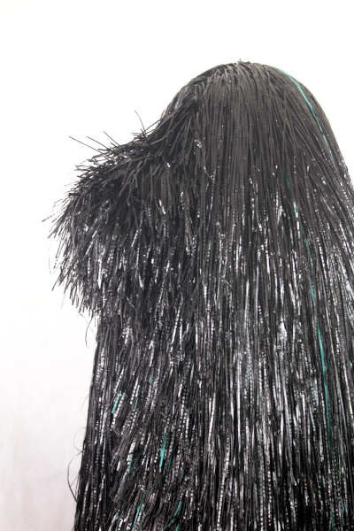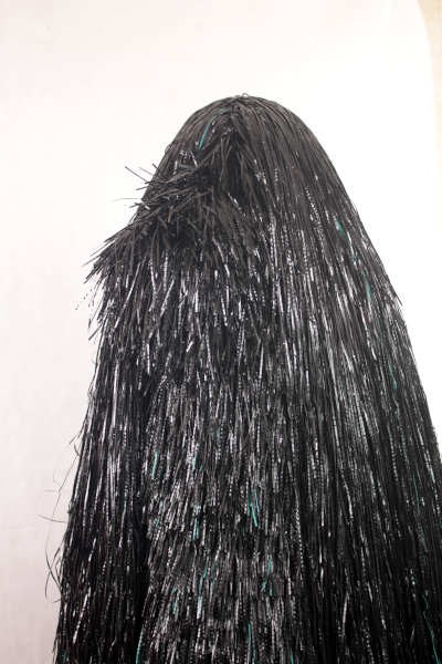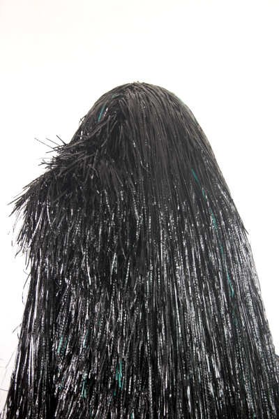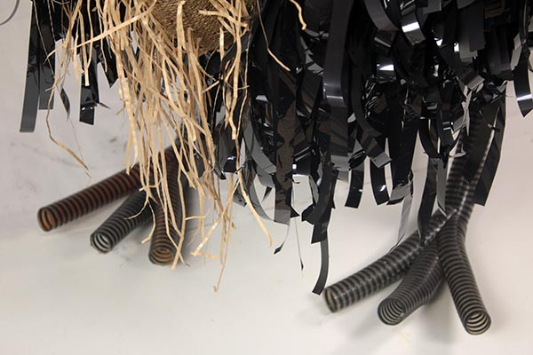 Composition: bandes magnétiques de VHS, filet de trampoline, câble de fibre optique, bâche noire, sangles et morceaux de poussette, tubes pvc, casque de vélo, fil de fer