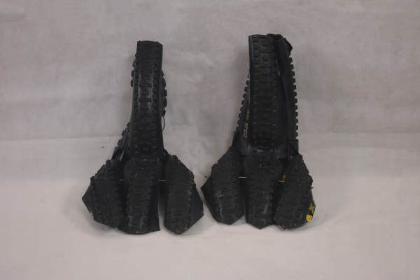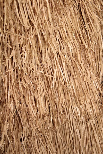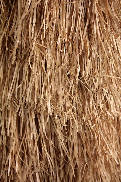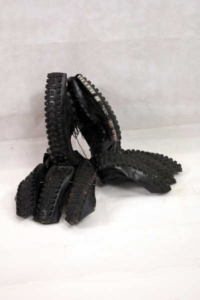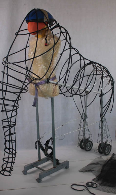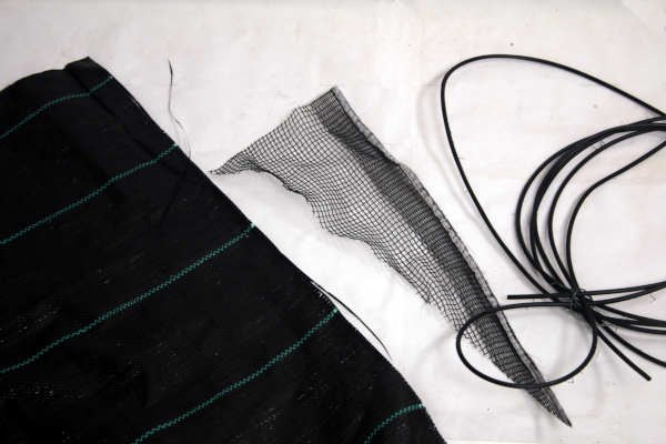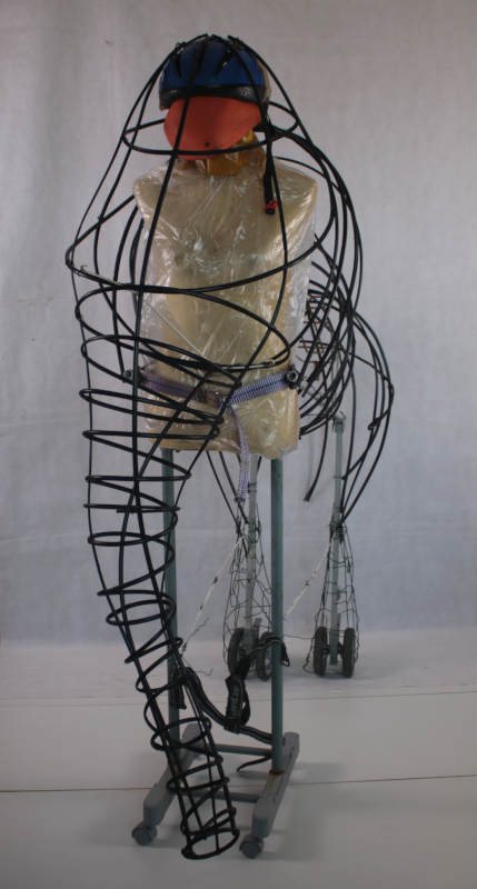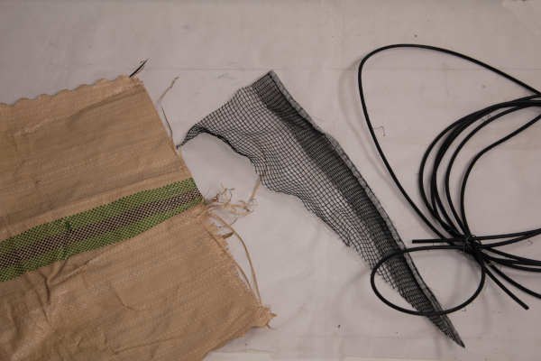Composition: bâches plastiques détissées, filet de trampoline, câble de fibre optique, bâche noire, sangles et grillage, 2 pattes à roulettes, carter en plastique, casque en polystyrène.