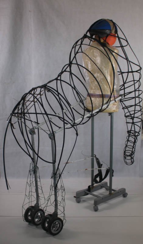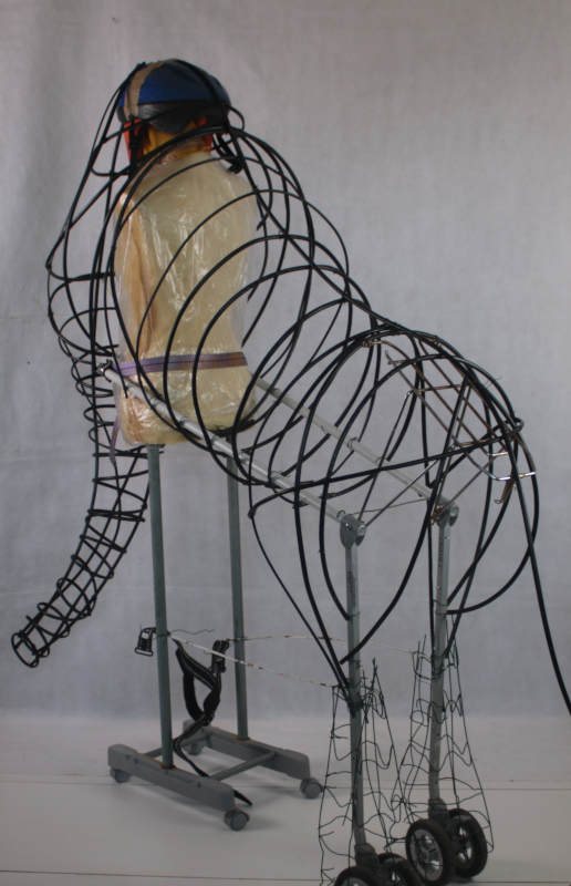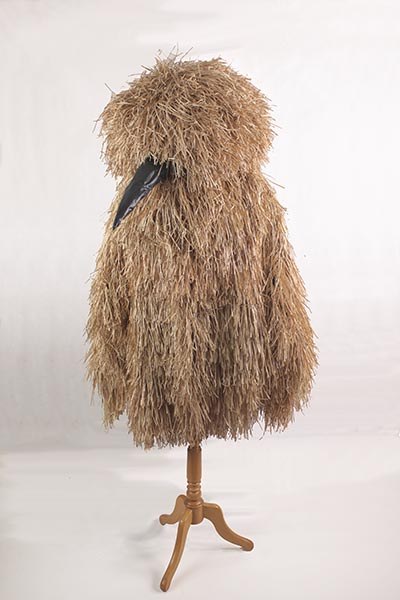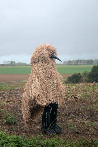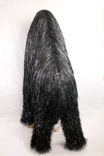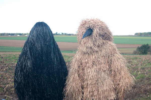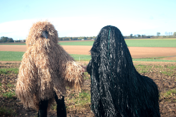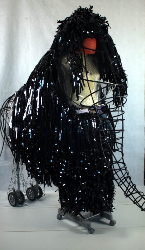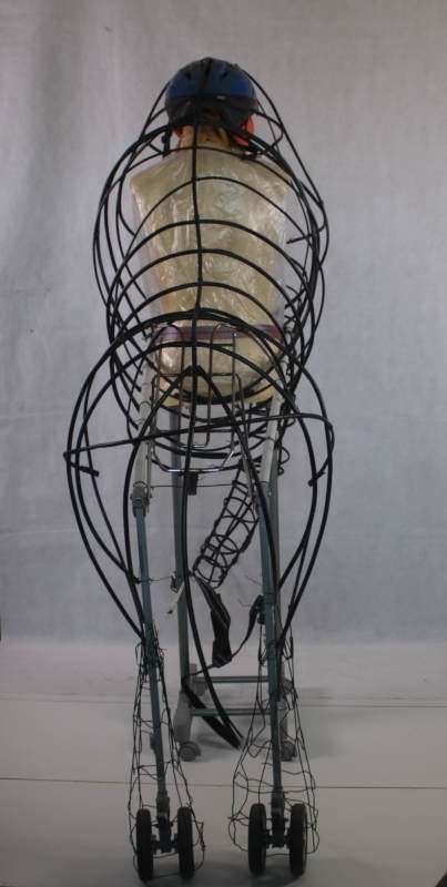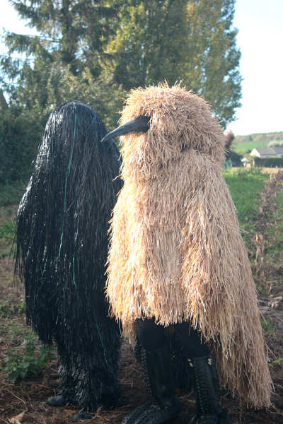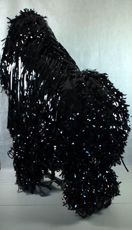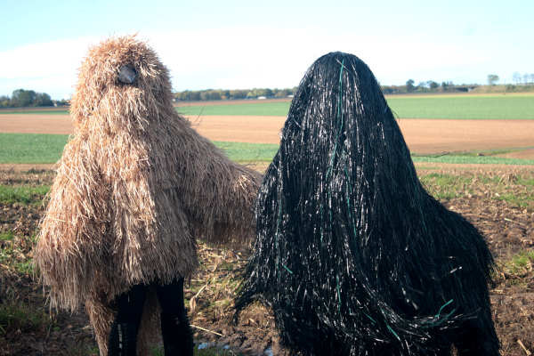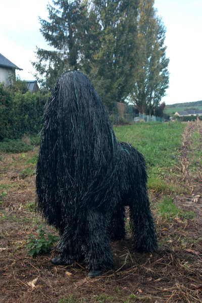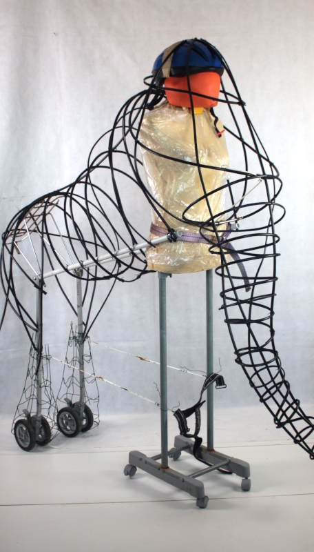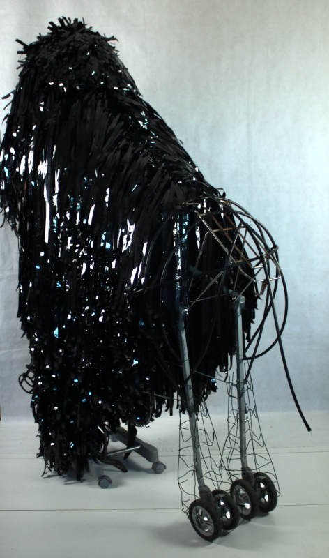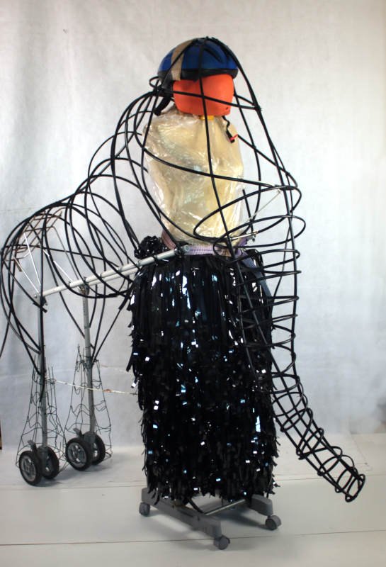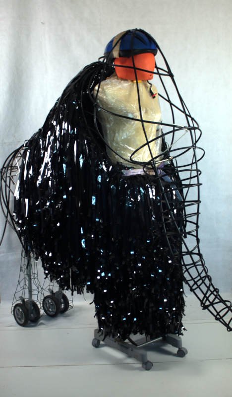 Suite du Projet Déchets Sauvage, l’humain rentre dans le décor en tant que système mobile naturel. Le corps humain disparait sous un volume animal. Poils/plumes en bâches détisses ou en bandes magnétiques sur des squelettes en gaines de câbles qui permettent de la souplesse au corps.