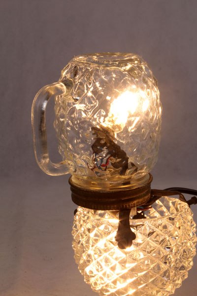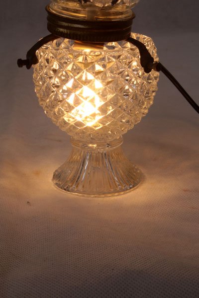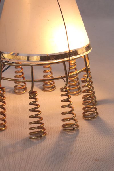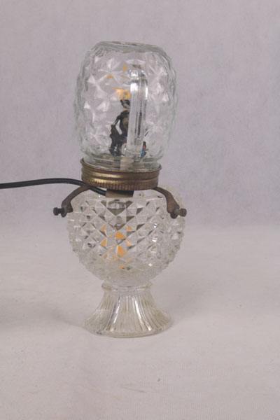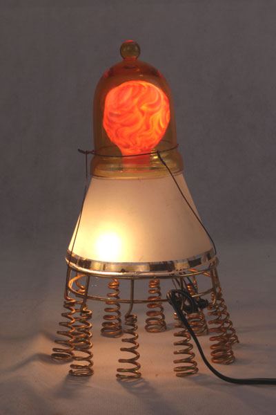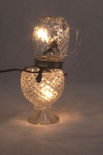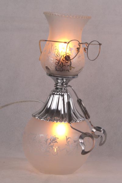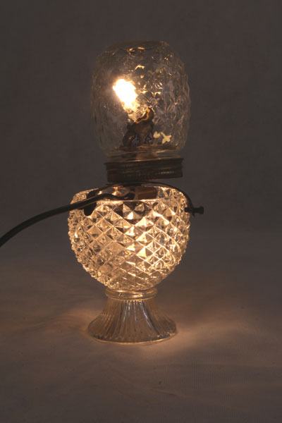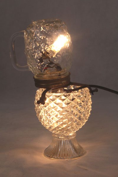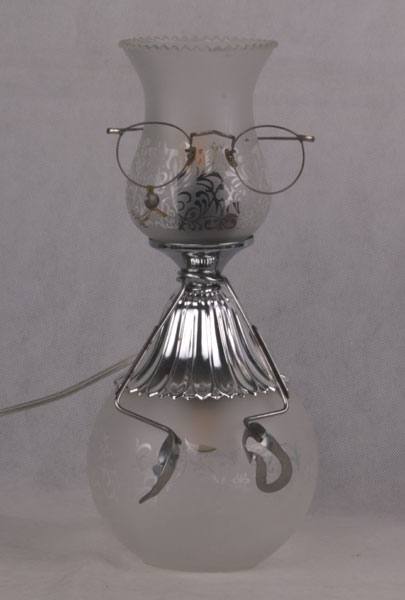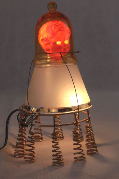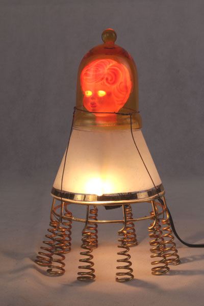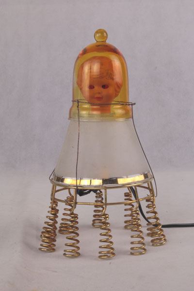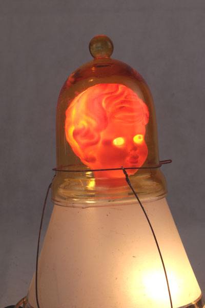 Composition: verre de lampe, support à bougie, support ressort, tête de poupée vintage.