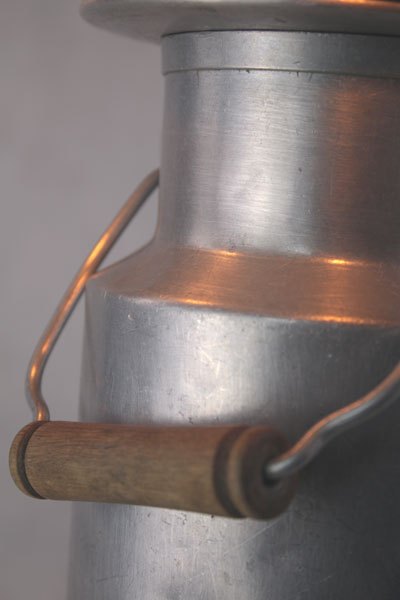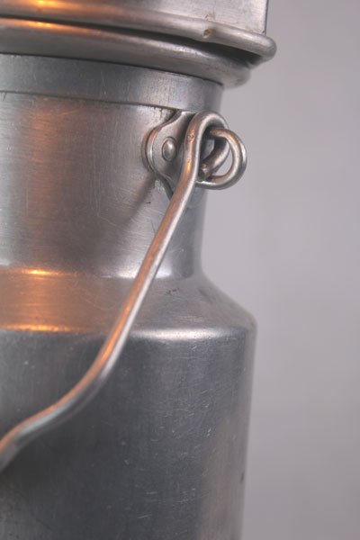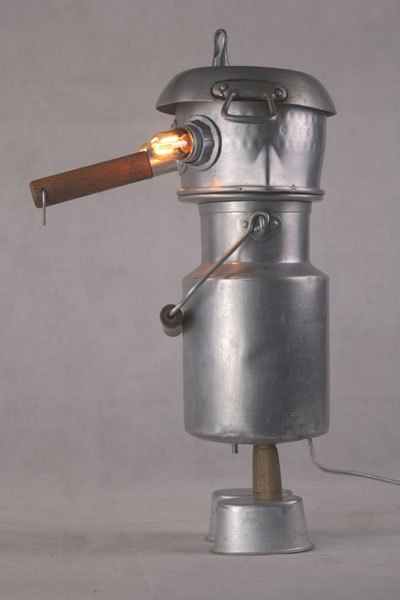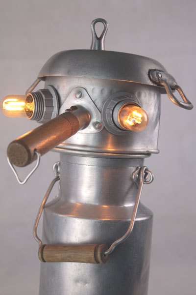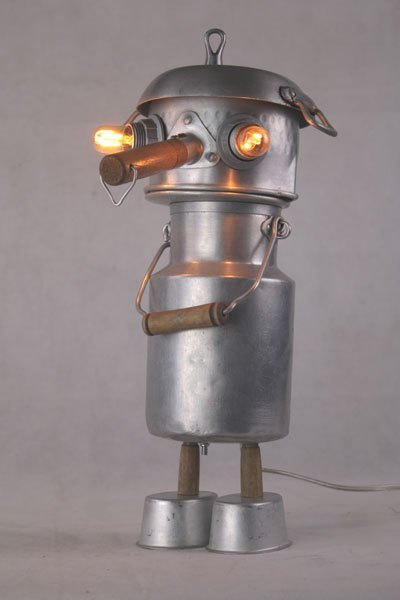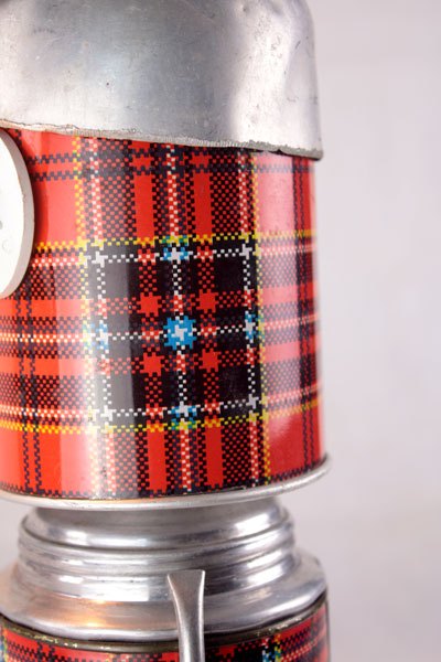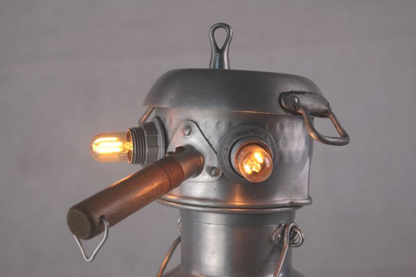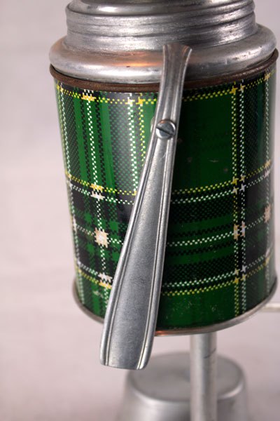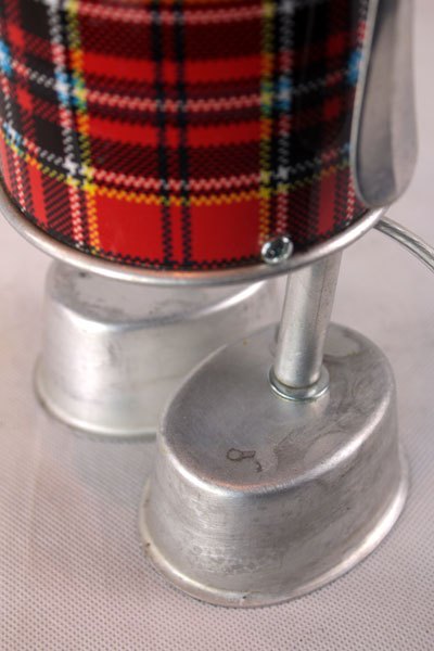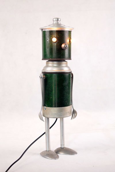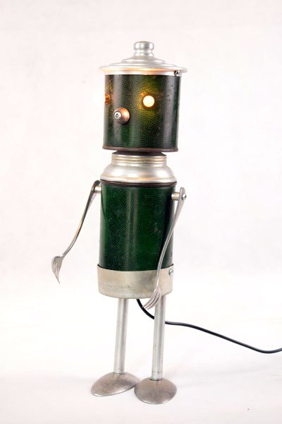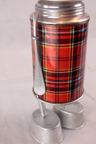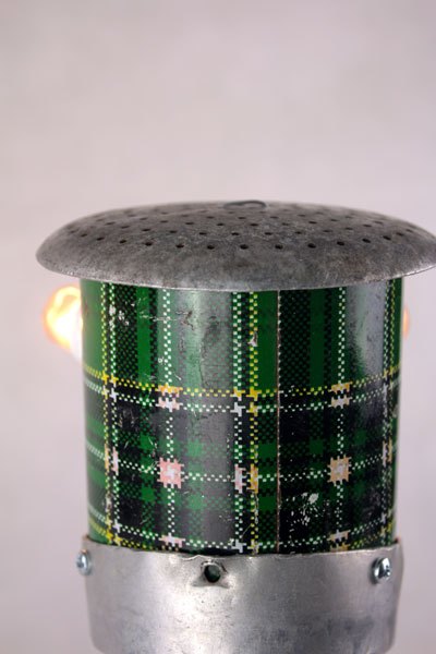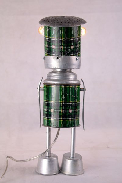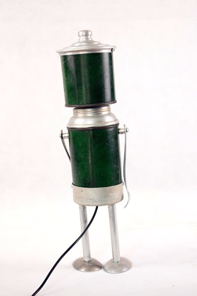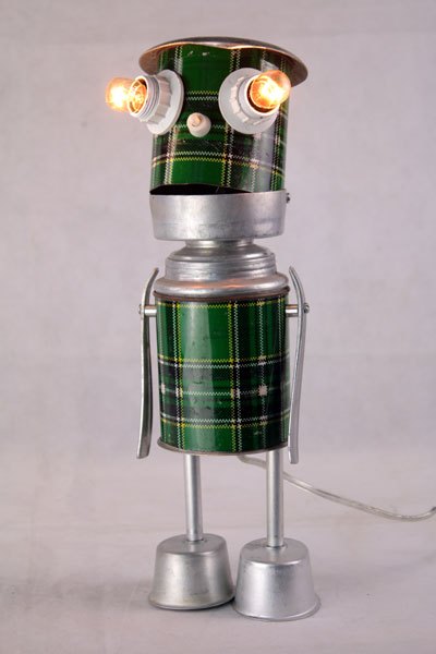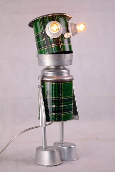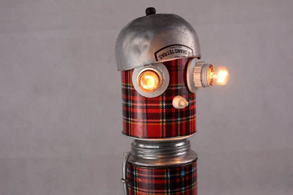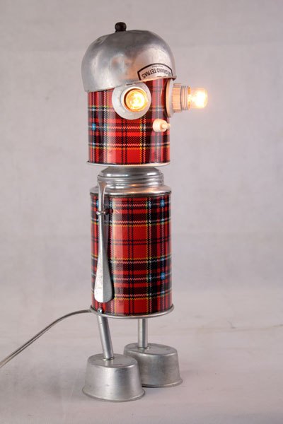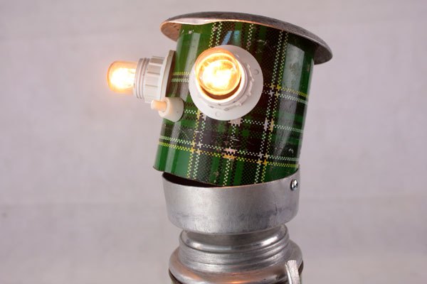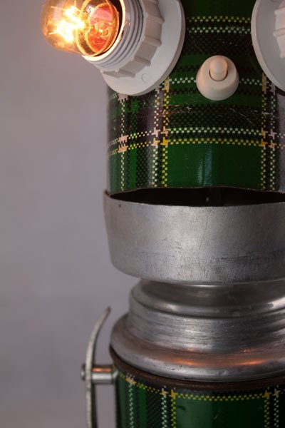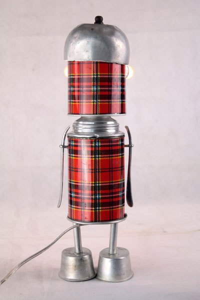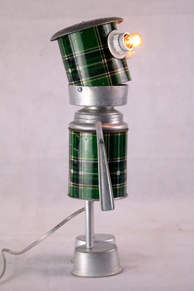 Personnage thermos écossais vert détourné, assemblage avec écumoire, moules, tube, couvercle et manches de cuillères. Sculpture lumineuse.