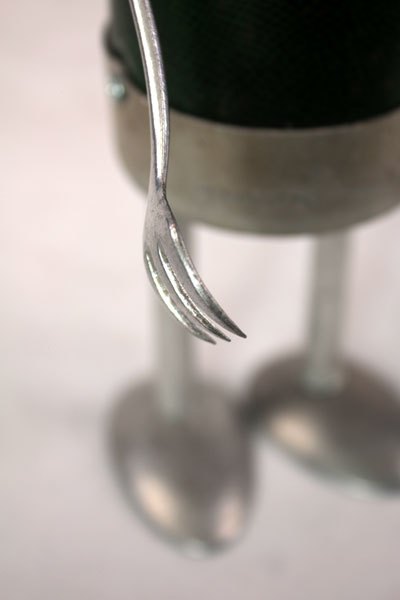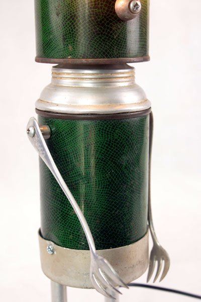 Bonhomme lumineux assemblage d’un thermos vert imitation serpent, deux couvercles, tube, deux fourchettes et deux cuillères.