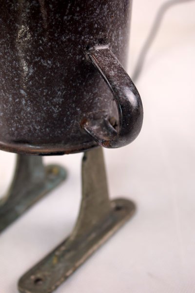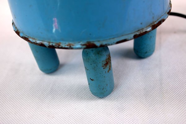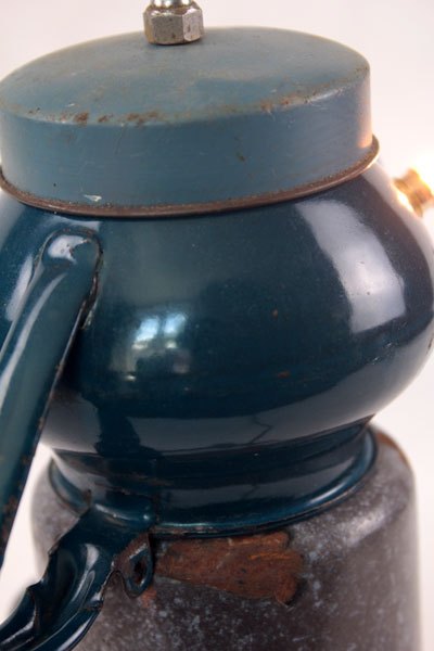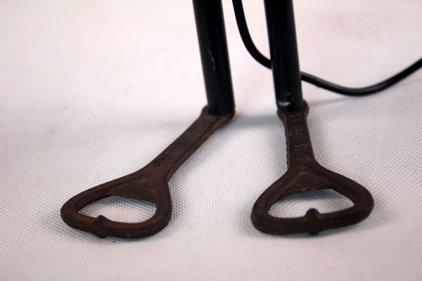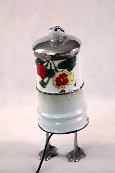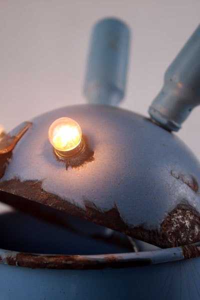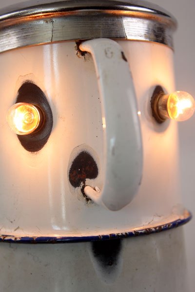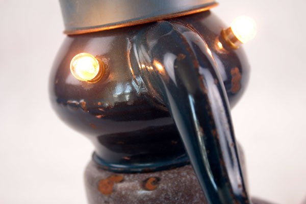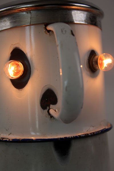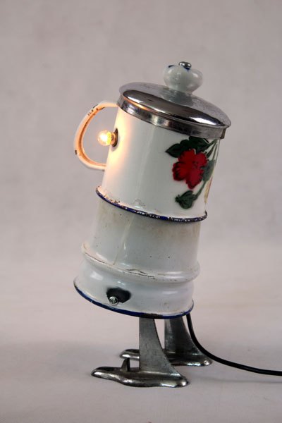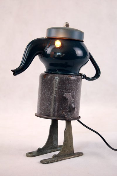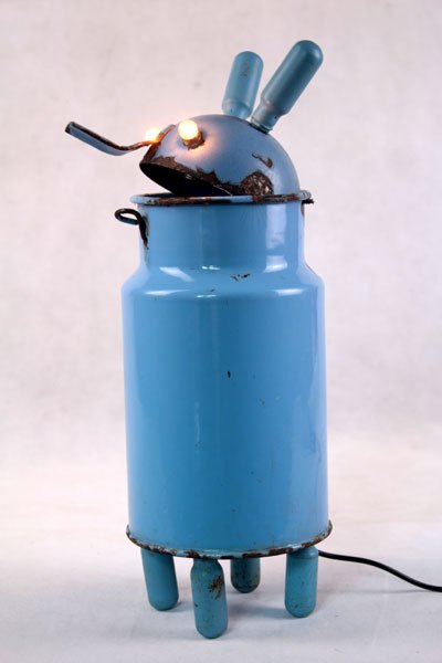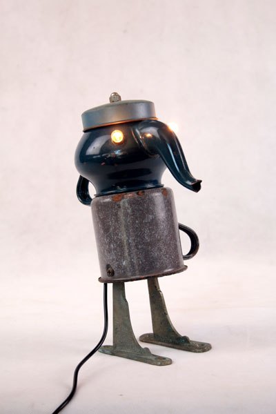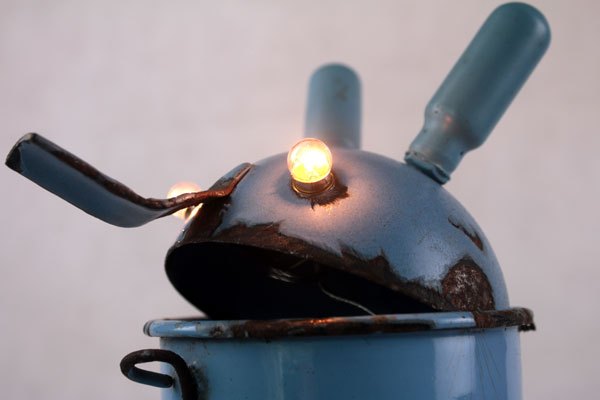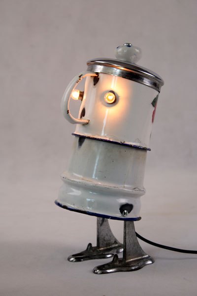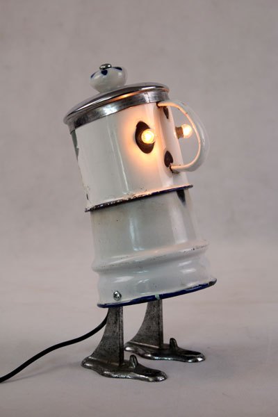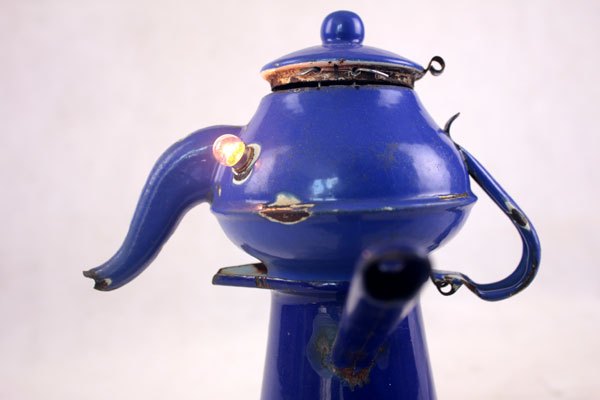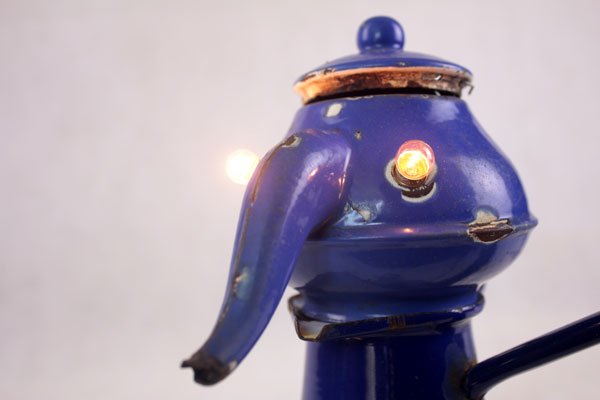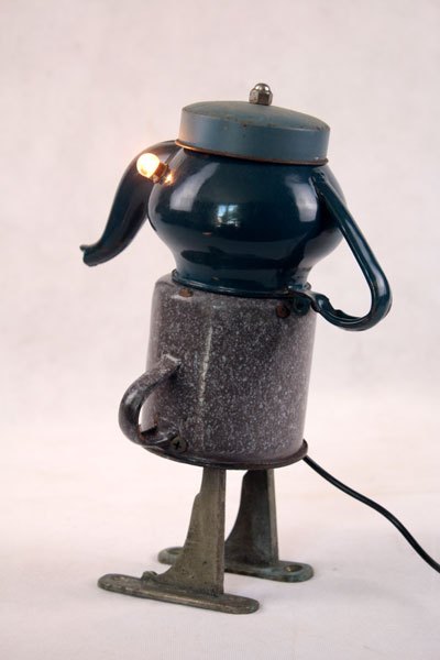 Character in blue enamel, assembly of a teapot and a pot, foot in bottle opener.