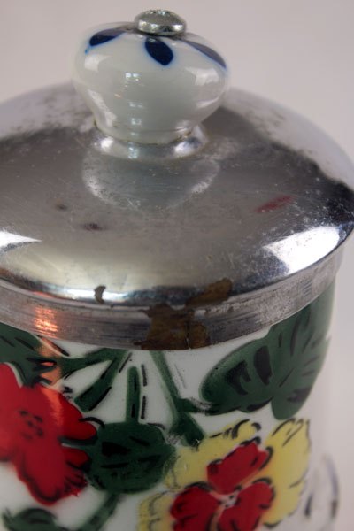 Matières: métal émaillé, métal chromé et porcelaine .