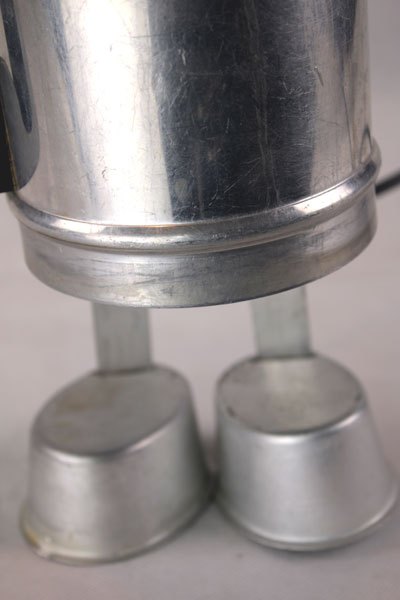 Personnage cafetière, assemblage d’ustensiles de cuisine en aluminium.