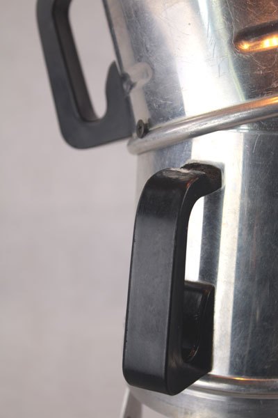 Bonhomme coffee maker, recomposition of a SEB coffee maker with two filters, two handles and a lid, aluminum.