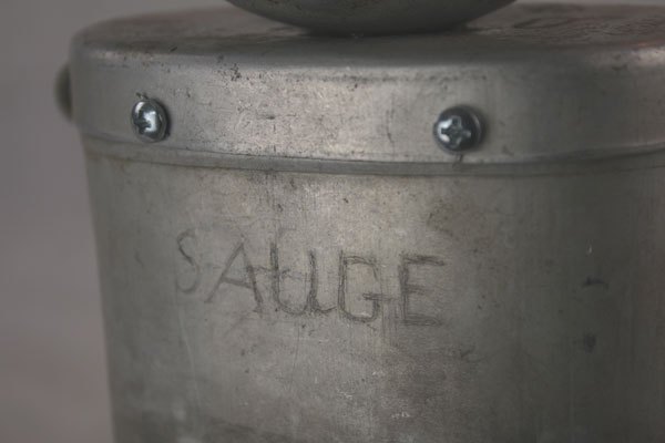 Diable en aluminium, assemblage d’une gourde, d’une bouilloire, de moules, crochets et poignées.