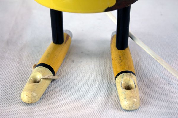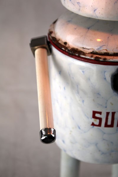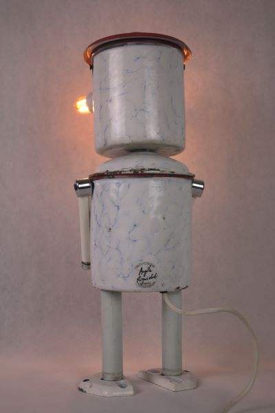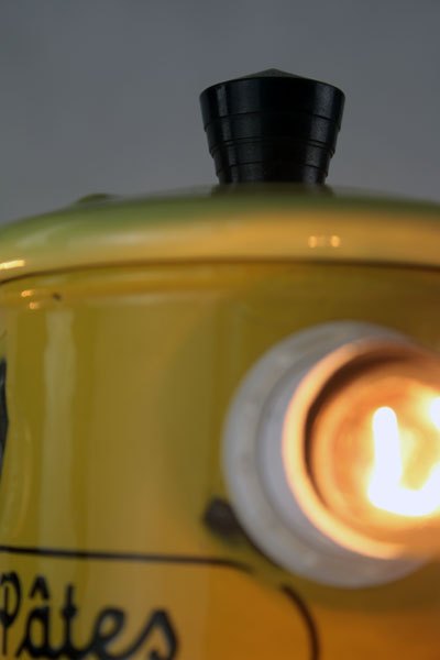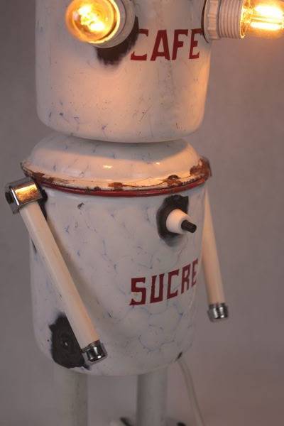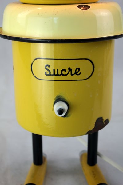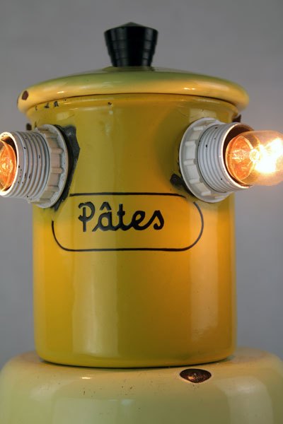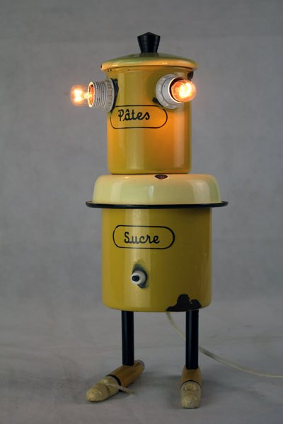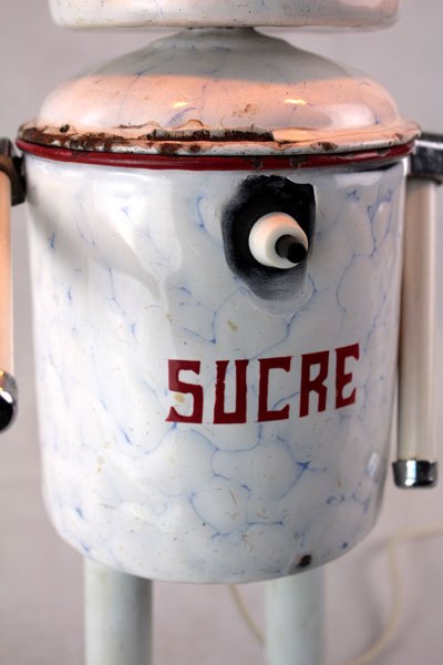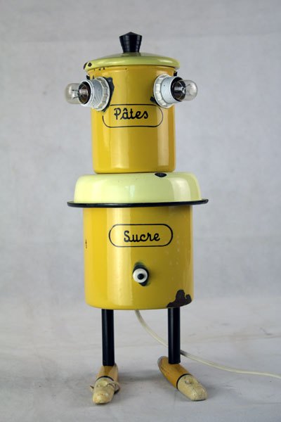 Personnage en émail jaune, assemblage de pots de pâtes et sucre, gamelle, tube et manches.