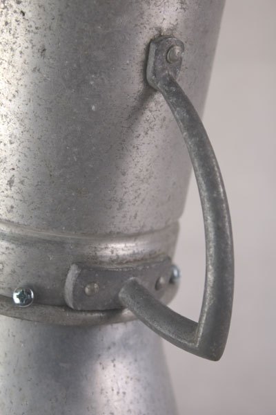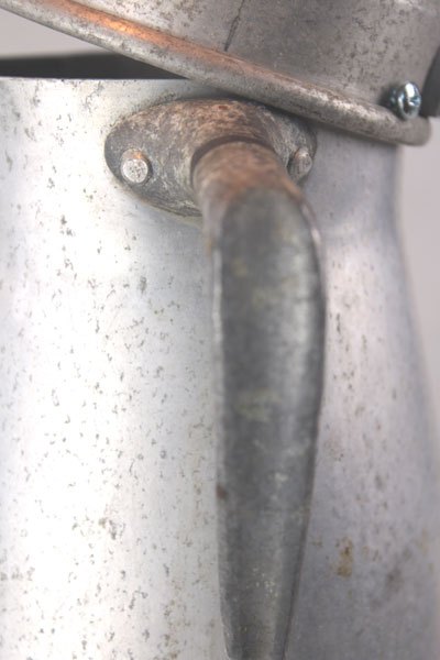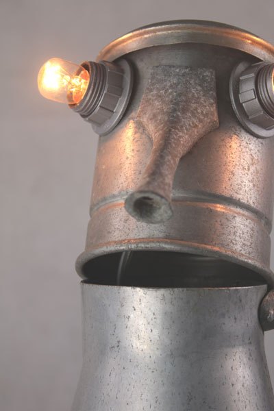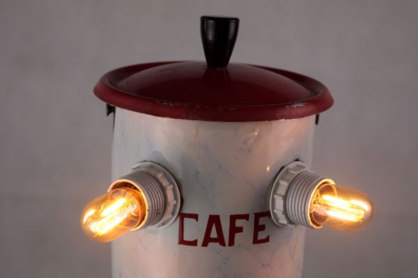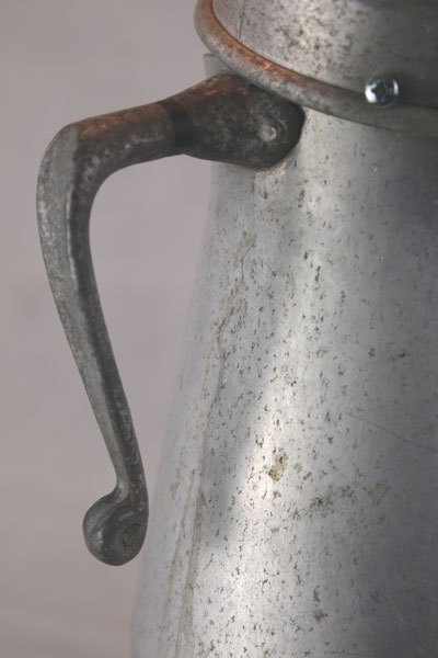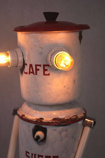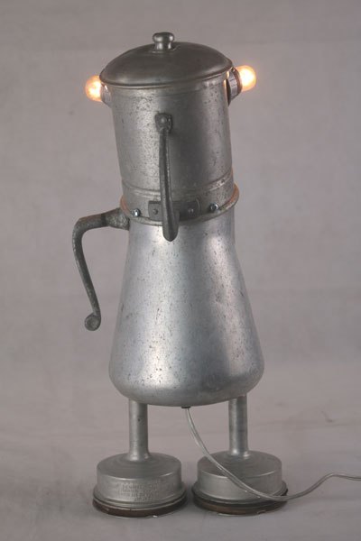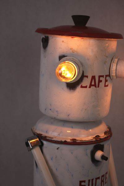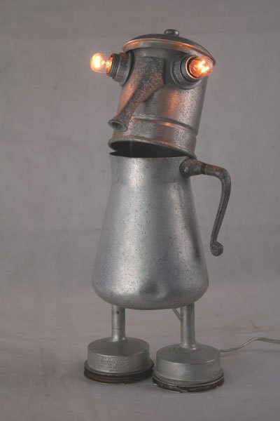 Old coffee maker and jar personified, aluminum assembly: pot, coffee maker, lid, filters. Sculpture diversion of objects.