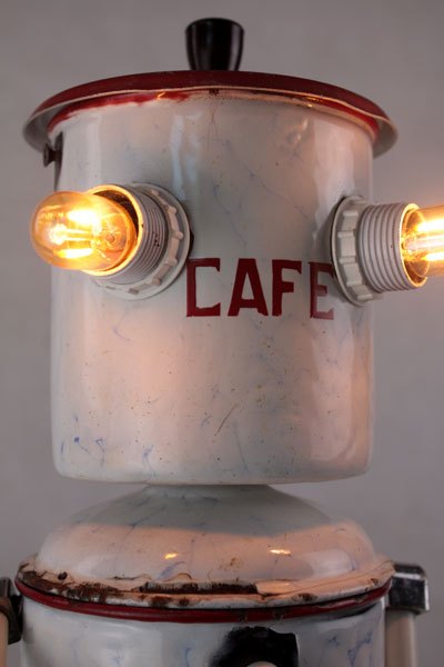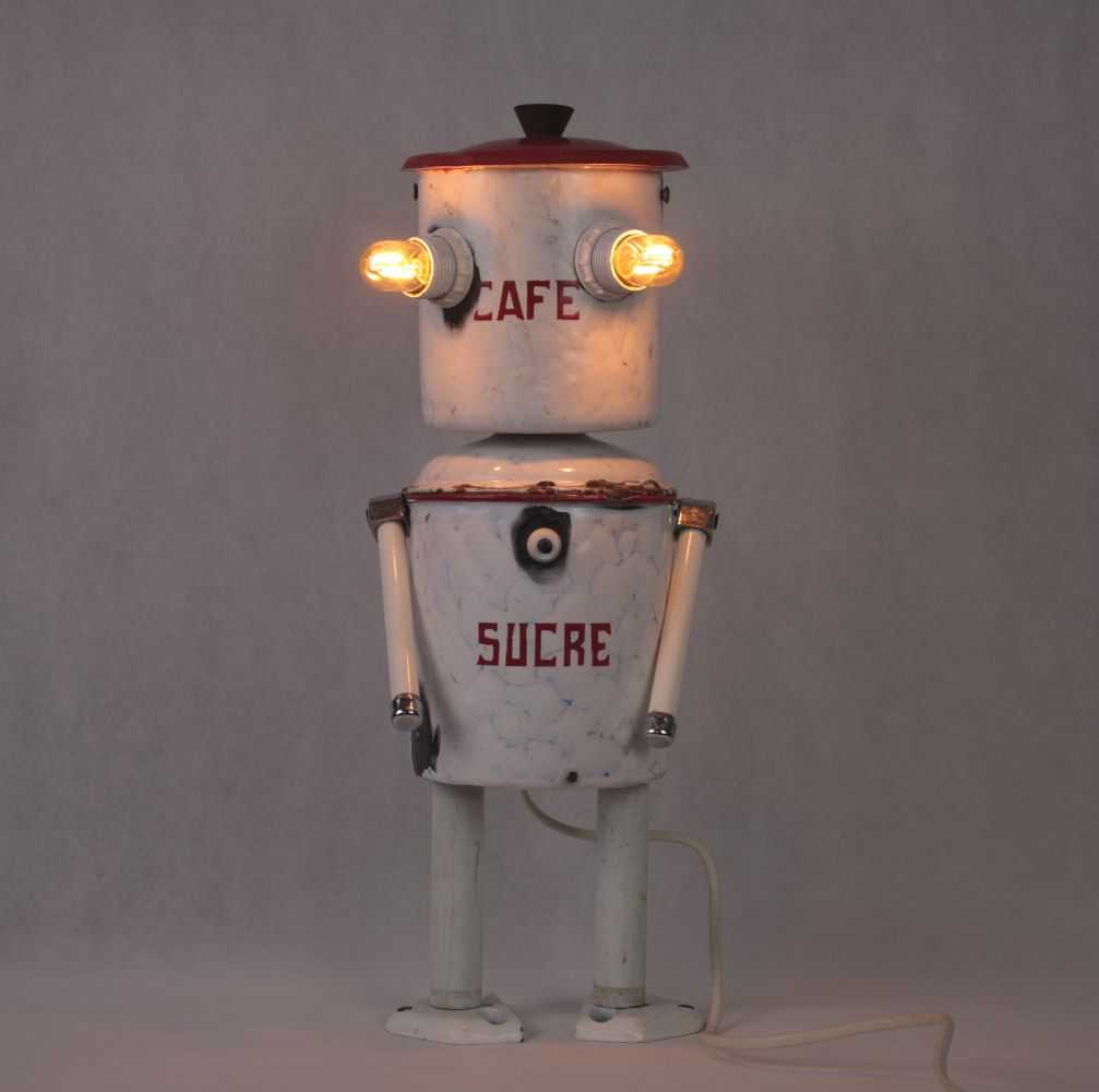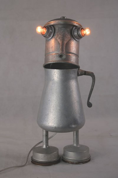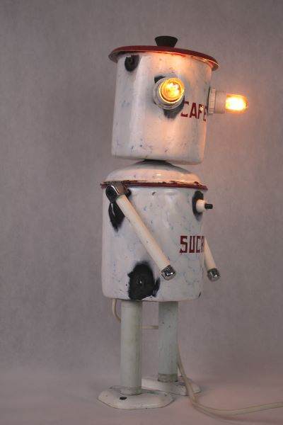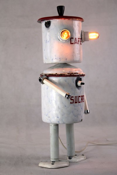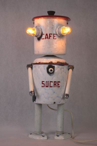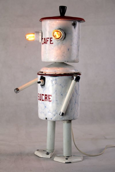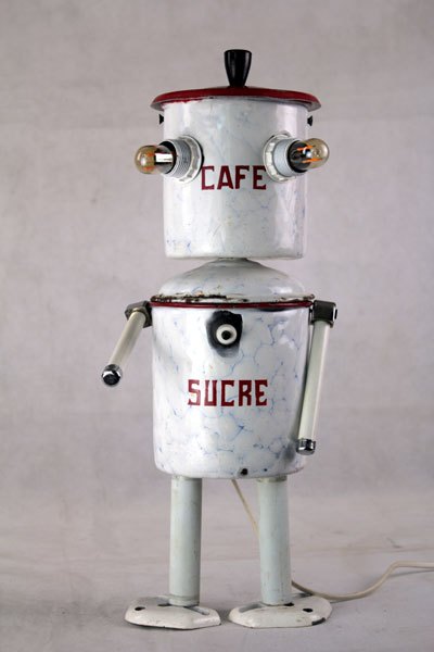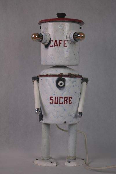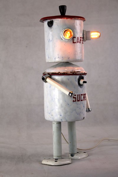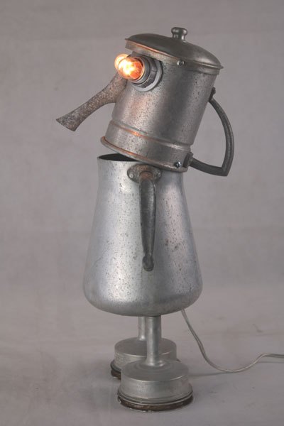 Ancienne cafetière et pot personnifiés, assemblage d’aluminium: pot, cafetière, couvercle, filtres. Sculpture détournement d’objets