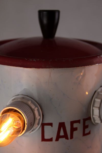 Personnage en émail avec pots de café et sucre anciens, tube et supports.