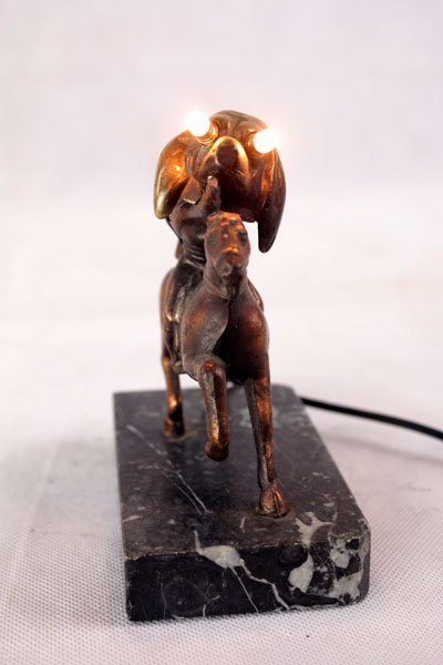 Composition: sculpture en fonte de cavalier et cheval et une tête de chien .