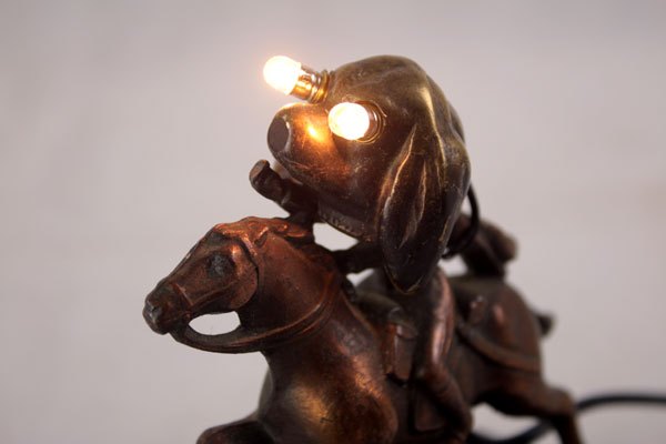 Assemblage de statues décoratives en fonte patinée, tête de chien sur un cavalier à la tête cassée.