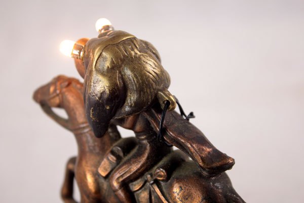 Assembly of decorative statues in patinated cast iron, dog’s head on a rider with a broken head.