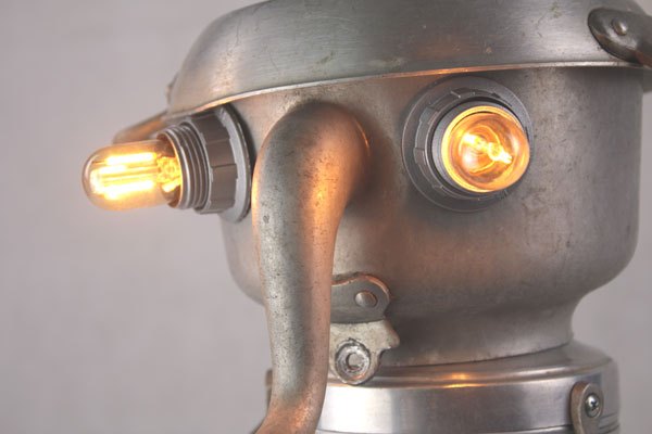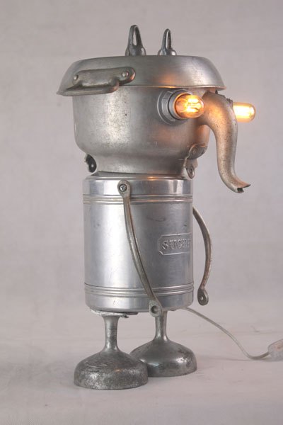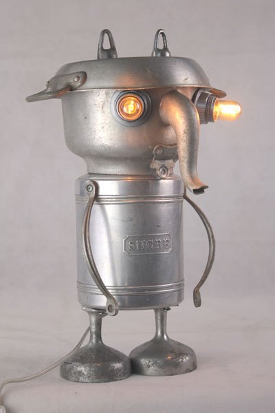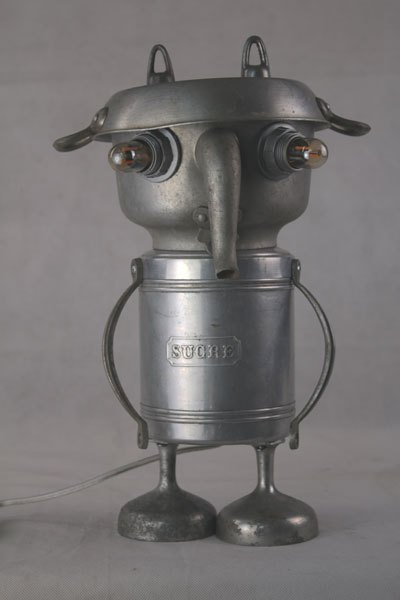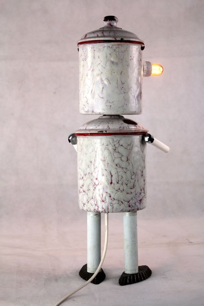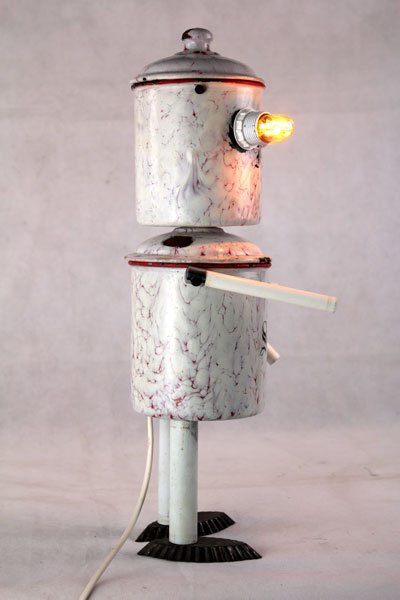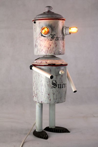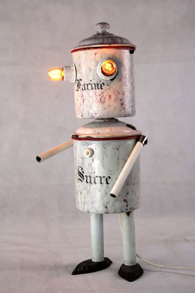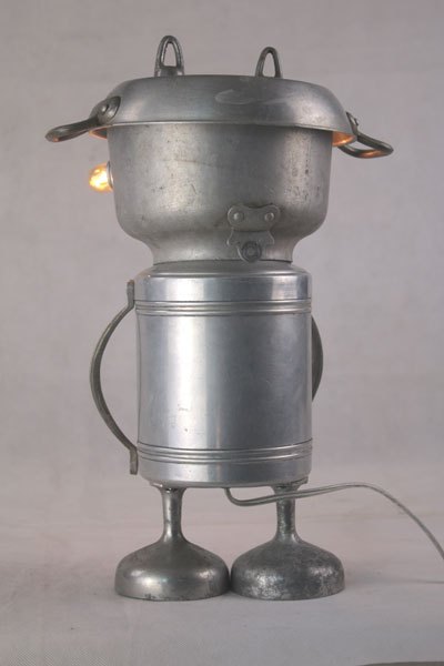 Personnage aluminium, assemblage d’une bouilloire sur un pot de sucre , bras en poignées et pieds avec des coupes en fonte d’aluminium.