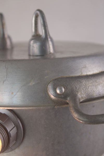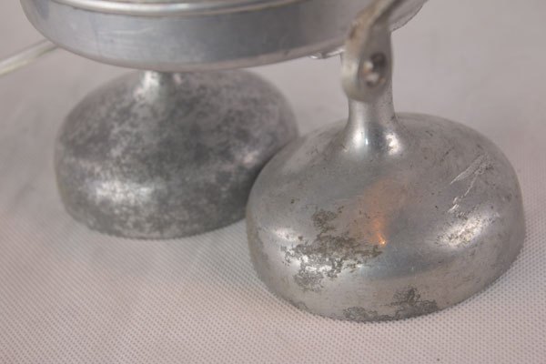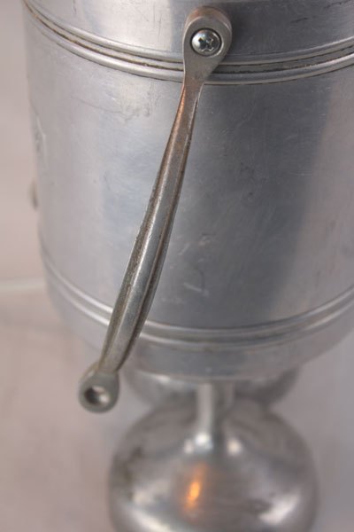Aluminum figure, assembly of a kettle on a sugar pot, arms in handles and feet with cuts in cast aluminum.