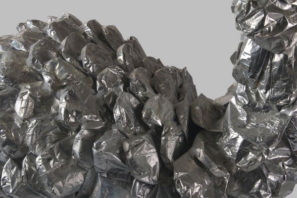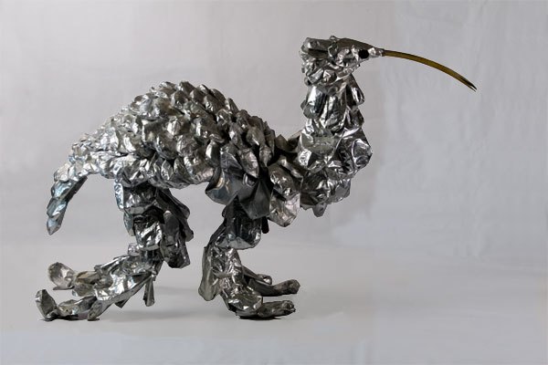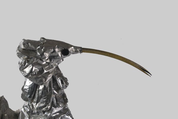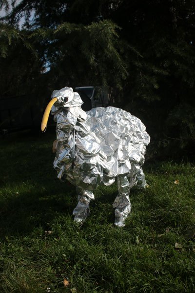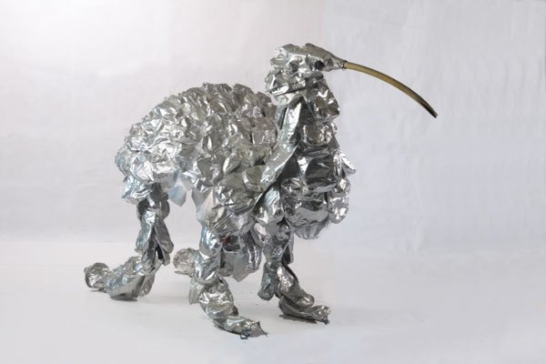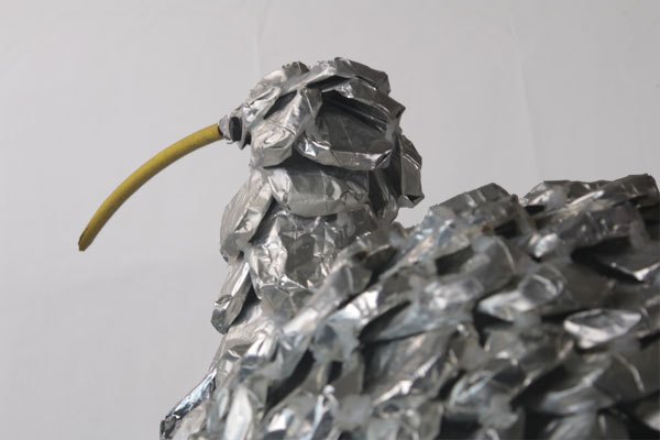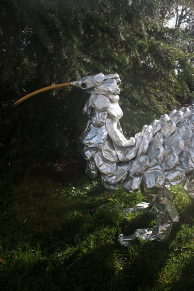 Animal à écailles en paquets de café retournés, sur une structure de fauteuil et tubes, bec en tuyau d’arrosage.