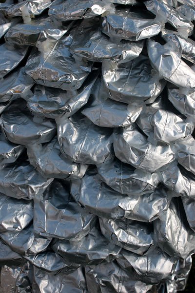 Composition: paquets de café retournés, structure de chaise, tubes.