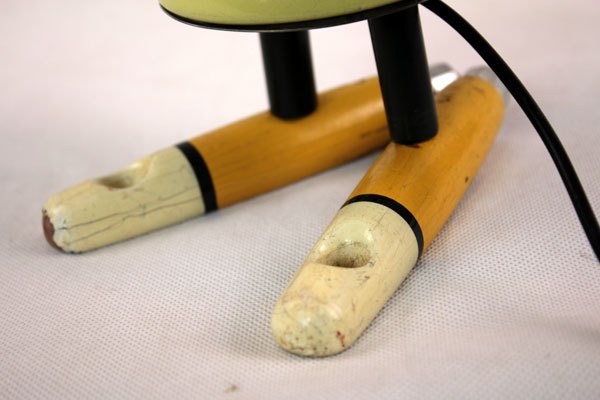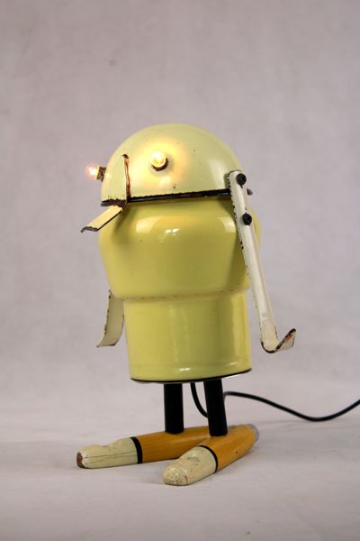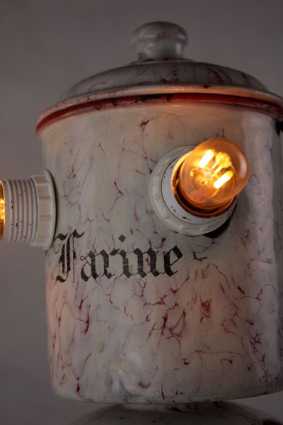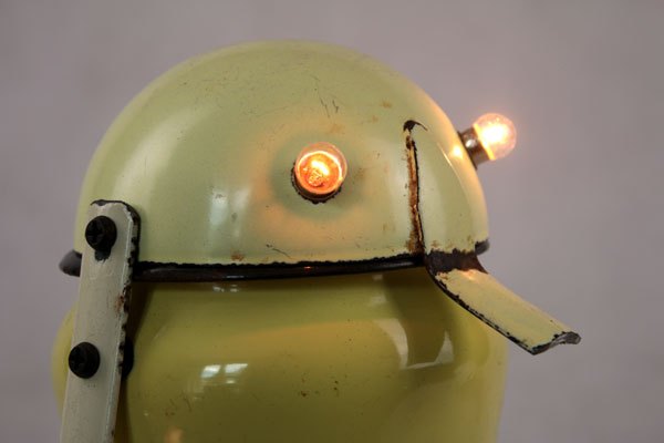 Personnage en émail jaune. Assemblage d’une louche, d’un pot et deux manches vintages.