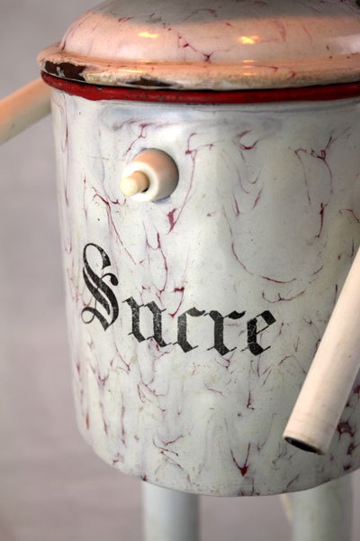 Personnage avec pots de farine et sucre émaillés anciens, tube et moule à gâteaux en forme de barquette.