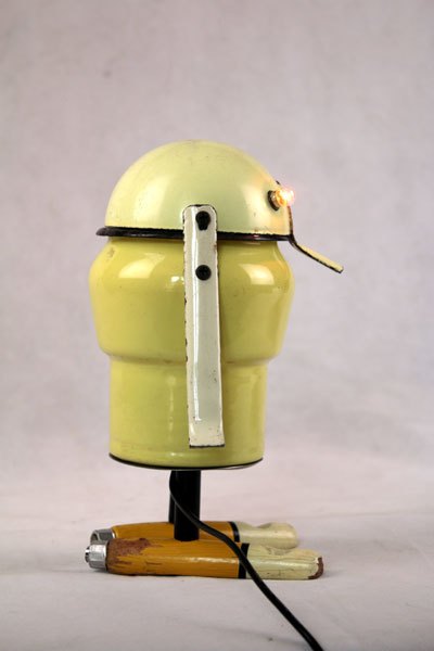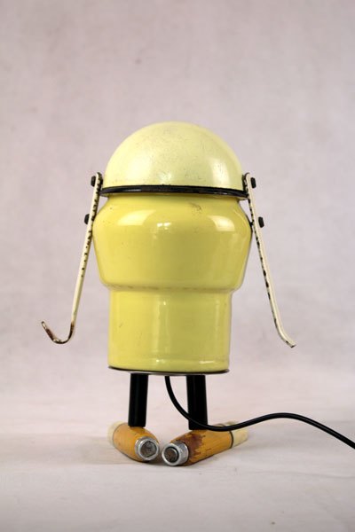 Character in yellow enamel. Assembly of a ladle, a pot and two vintage sleeves.