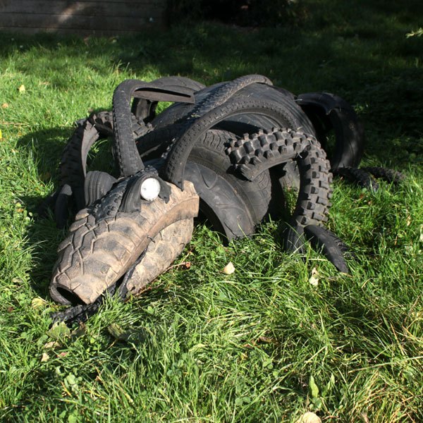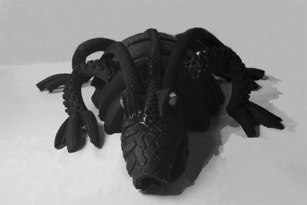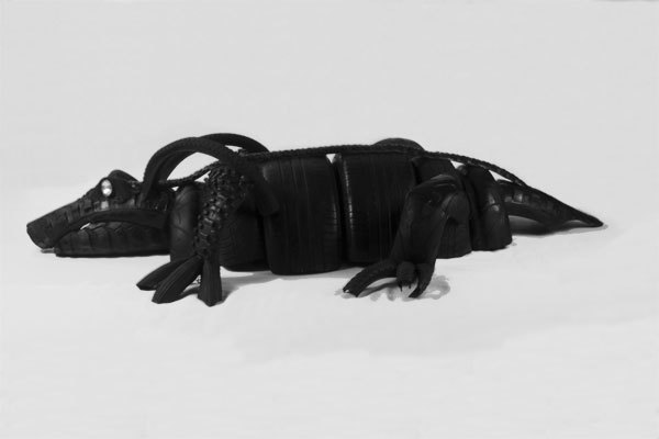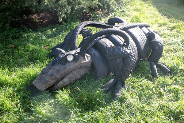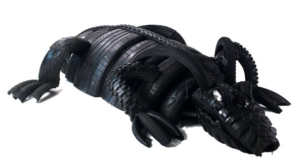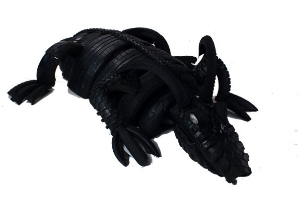 Dragon crocodile in tire, recycling rubber, car and bike rubber.