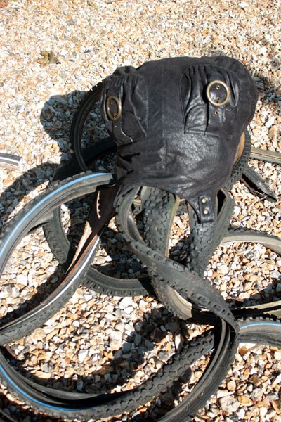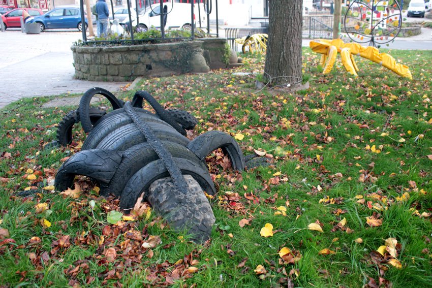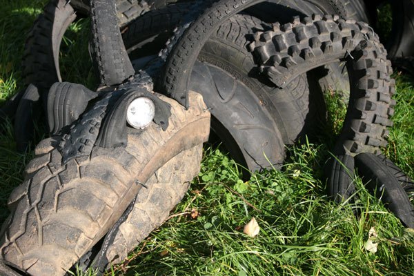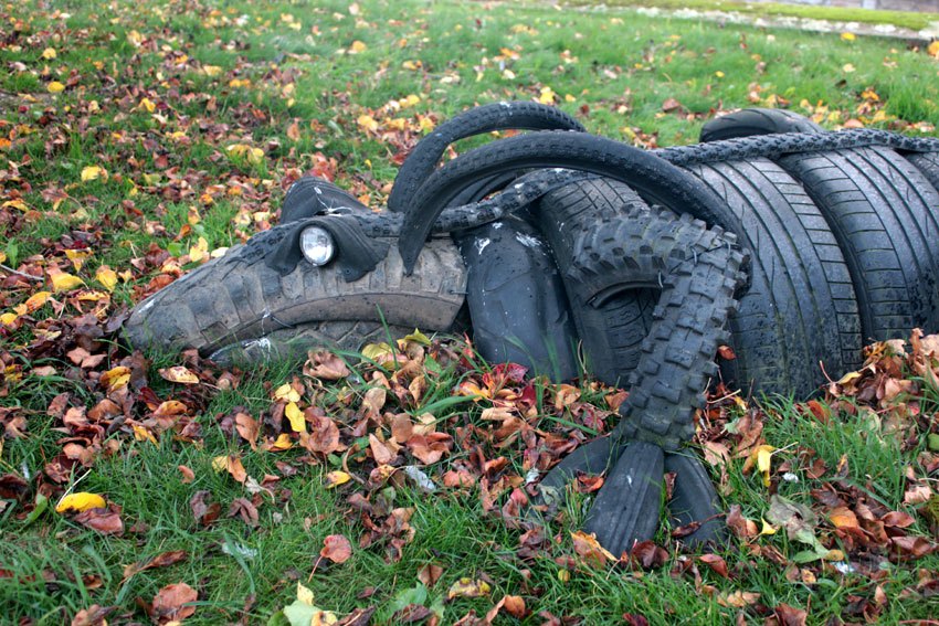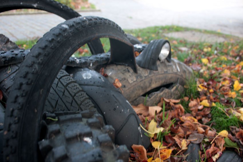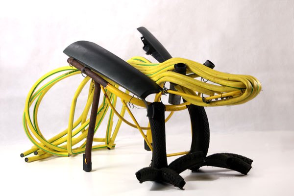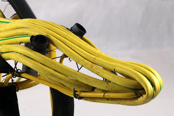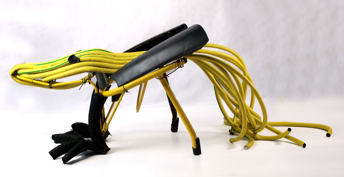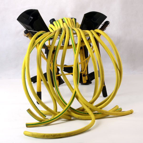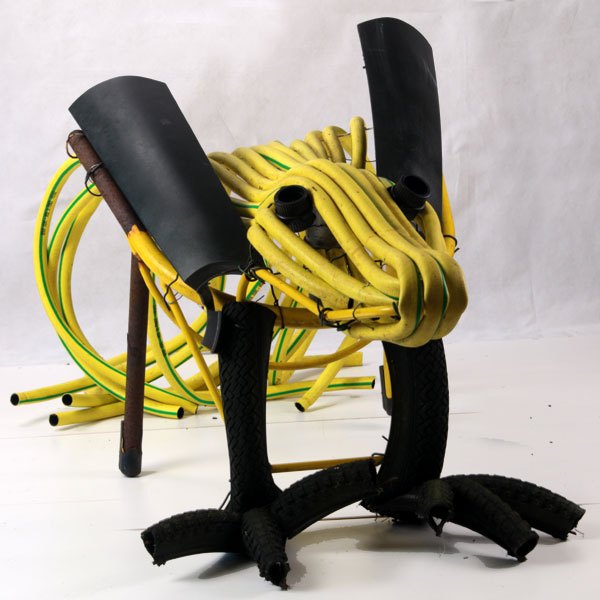 Composition: tuyau d’arrosage, structure de chaise, pneus de VTT, pièce de voiture.