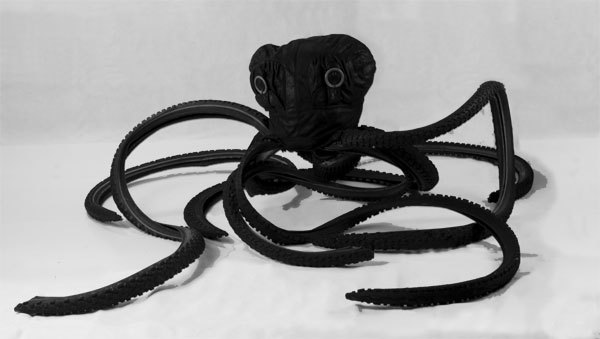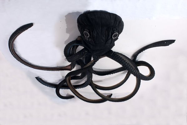 Pieuvre en pneu, recyclage de gomme caoutchouc de VTT, assemblé avec un sac à main.