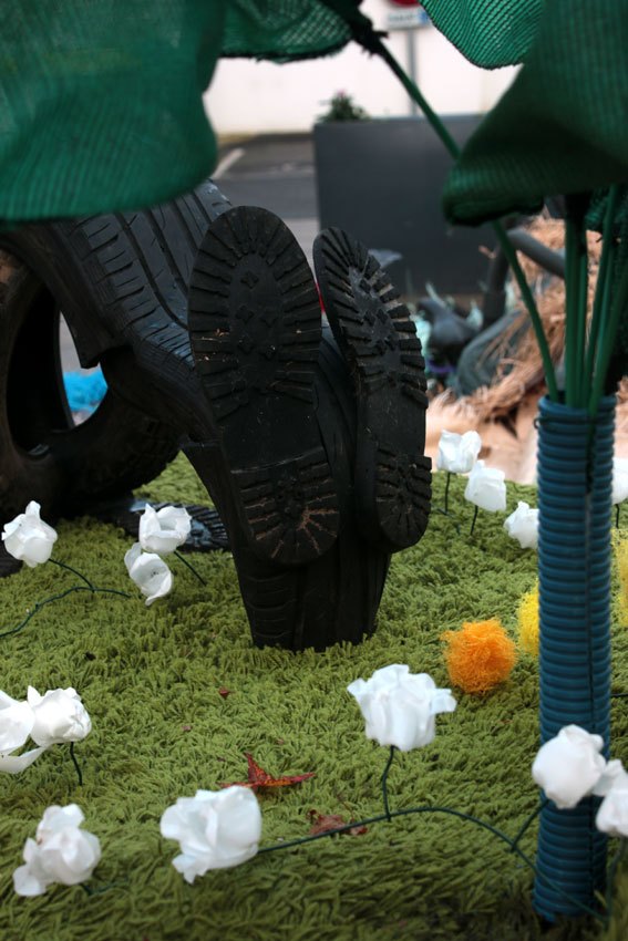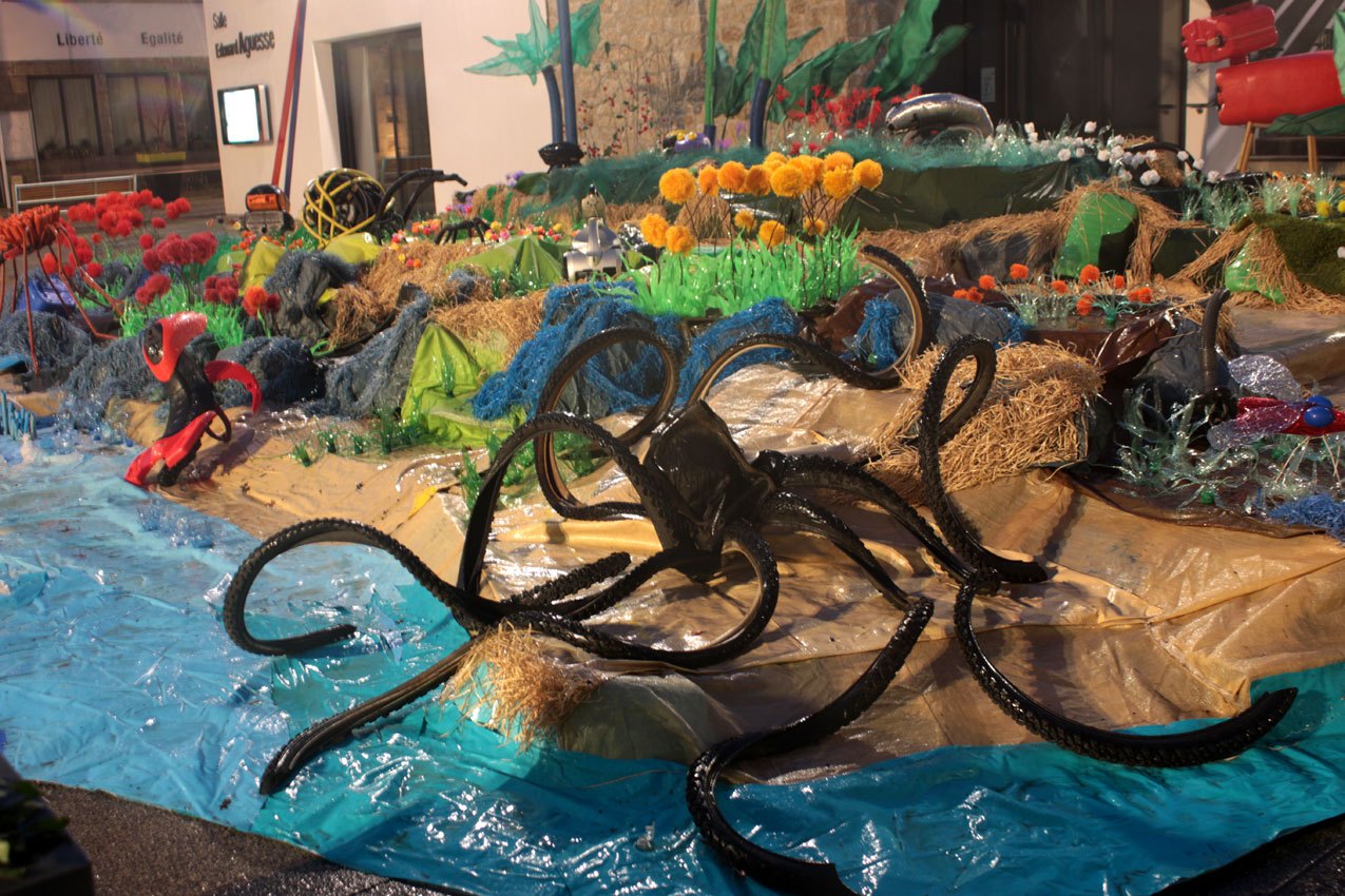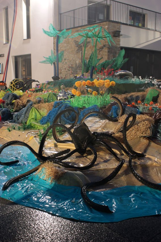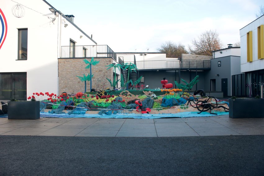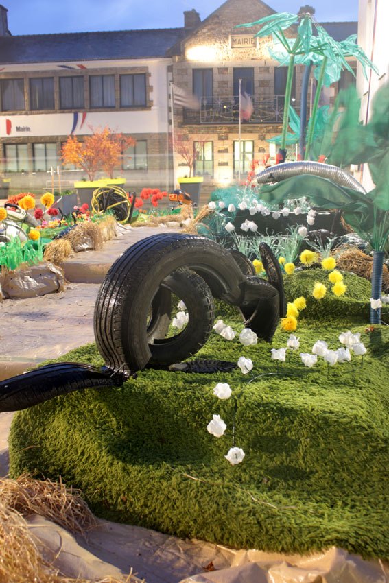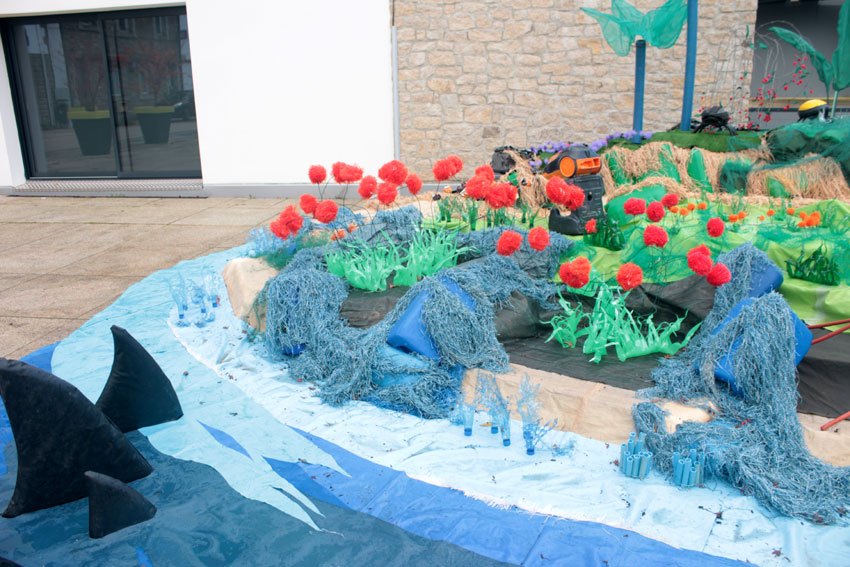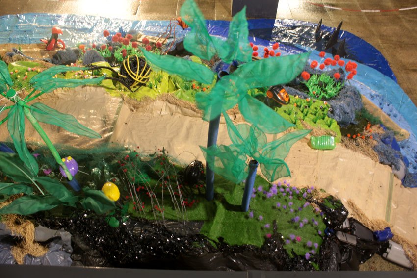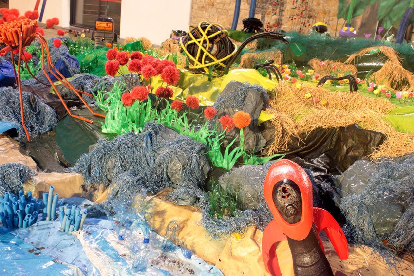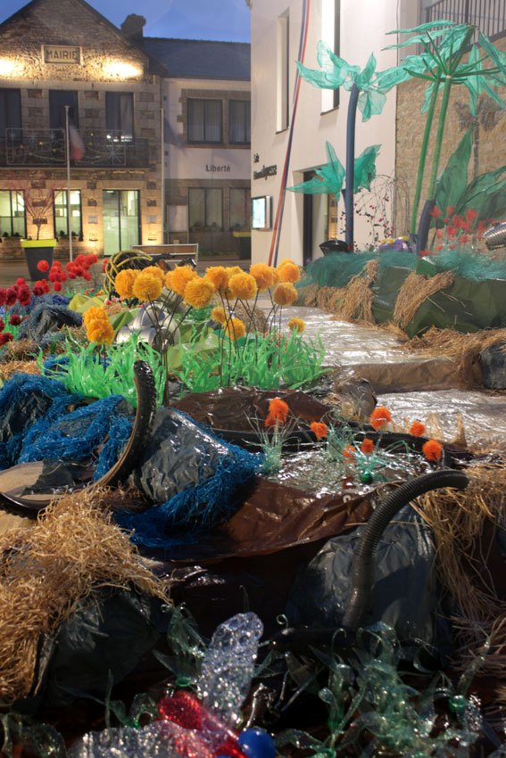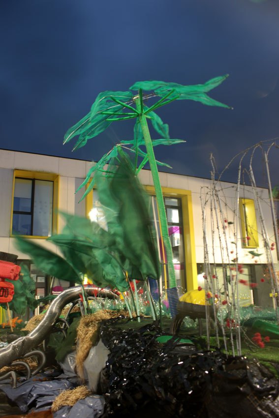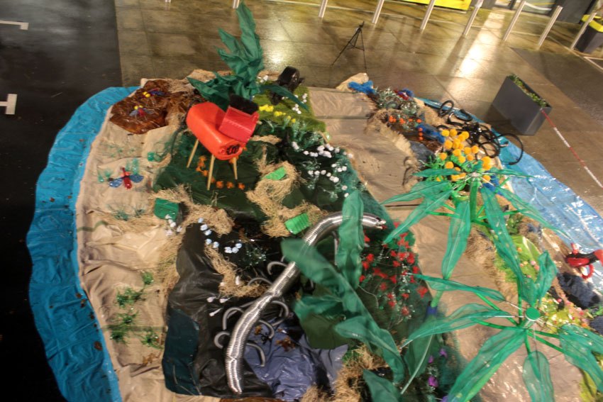 Ce fut l’’occasion d’utiliser des techniques et assemblages développés depuis des années avec les ateliers enfants de bricolage-recyclage, et de les pousser plus loin. Le thème de l’île est un bon prétexte pour aborder tous les éléments de la nature: végétation, l’eau, le sable, les rochers, les fleurs, les herbes, les algues, les animaux, les insectes. C’est un microcosme en déchet, il ne s’agit pas de recréer la nature qui est inimitable mais de s’en inspirer pour essayer de s’en approcher.